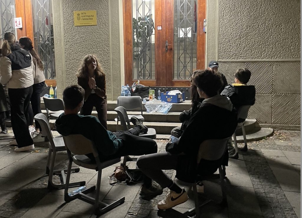 Jedno veče sa đacima Pete: „Ovo će trajati mnogo duže od dve nedelje“Iako je uveliko prošlo osam uveče, do kada inače traje nastava, Peta gimnazija je puna. Đaci je čuvaju iznutra, a napolju su im pritekli u pomoć roditelji, veterani, zborovi i građani. Ova škola ponovo je blokirana, ali blokade nisu iste kao lane, kažu njeni đaci za „Vreme“