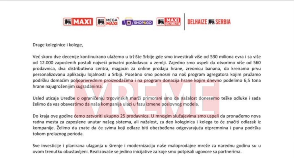 „Vreme“ otkriva: Interni dokument najavljuje otkaze u Maksiju„Vreme“ ekskluzivno objavljuje interni dokument o otkazima koji je izvršni odbor Delez Srbija poslao zaposlenima. I to nije sve. U njemu za promene poslovne dinamike direktno krive Vučićeve marže