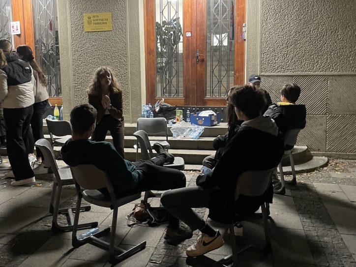 Iako je uveliko prošlo osam uveče, do kada inače traje nastava, Peta gimnazija je puna. Đaci je čuvaju iznutra, a napolju su im pritekli u pomoć roditelji, veterani, zborovi i građani. Ova škola ponovo je blokirana, ali blokade nisu iste kao lane, kažu njeni đaci za „Vreme“