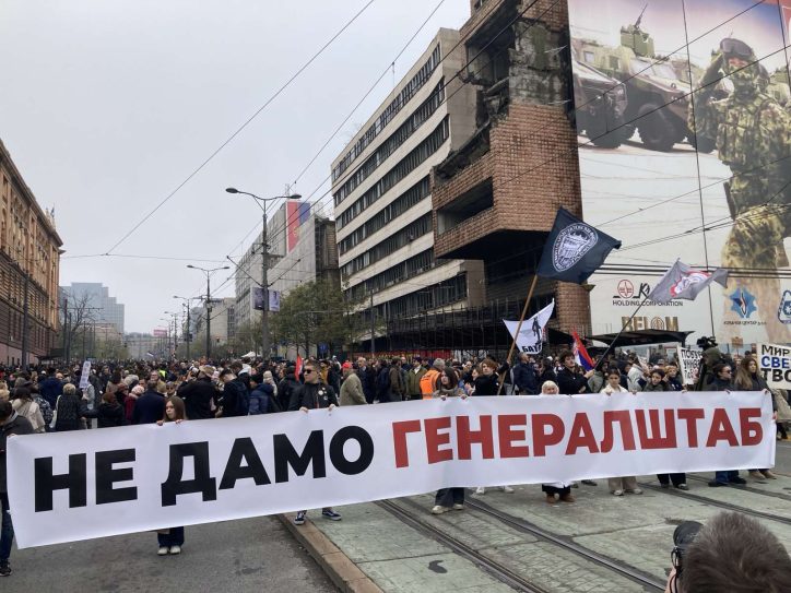 Studenti nekoliko beogradskih fakulteta i inicijativa Ansambl Generalštab održali su protest ispred zgrade Generalštaba, uz poruku da će „svojim telima braniti” ovaj simbol Beograda ako vlast ne odustane od planova za njegovo rušenje. Prisutni su napravili „obruč" oko ovog zdanja, i nacrtali crvenu liniju oko njega preko koje je onima, koji planiraju rušenje ovog kulturnog dobra - prelaz zabranjen
