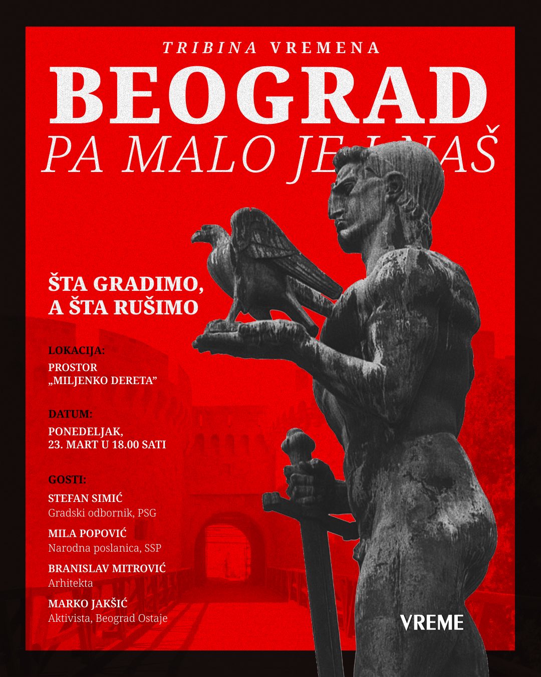 Druga tribina iz ovog ciklusa, pod nazivom „Šta gradimo, a šta rušimo”, biće posvećena urbanizmu u Beogradu. Razgovaraćemo o načinu na koji se planira i gradi u gradu, o odnosu između javnog interesa i investitorskih projekata, o sudbini javnih prostora, zelenih površina i nasleđa, ali i o tome da li Beograd ima jasnu viziju razvoja ili se menja stihijski.