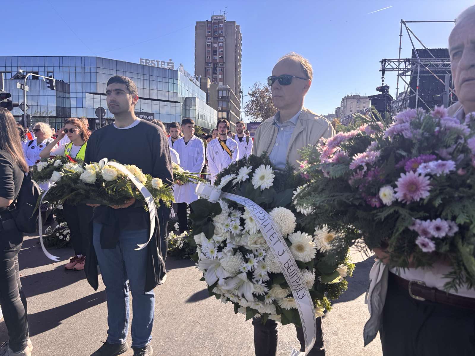 Nakon 16 minuta tišine, završene sa „Slava im“ i aplauzom, predstavnici zborova građana Novog Sada i Dijana Hrka, majka jednog od poginulih, prvi su položili vence u bluzini mesta tragedije.