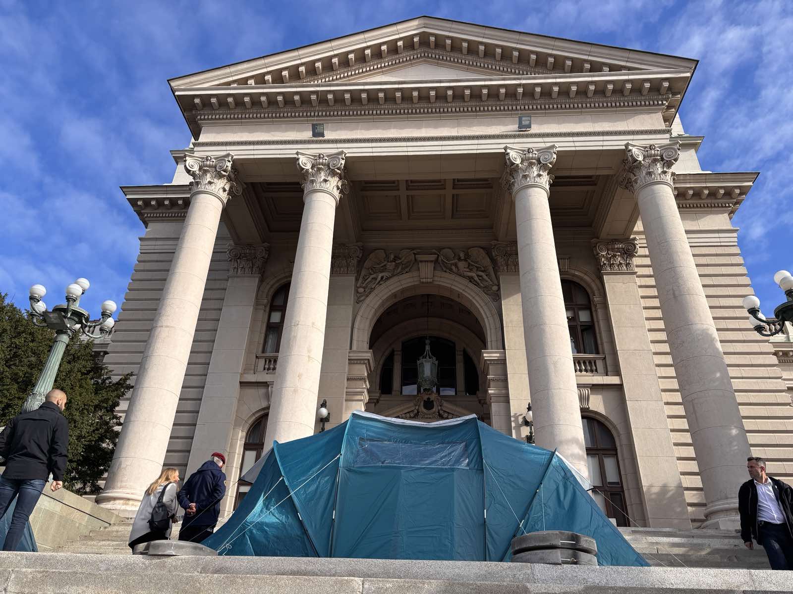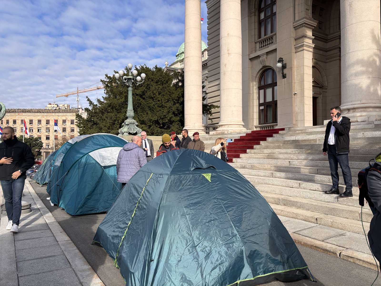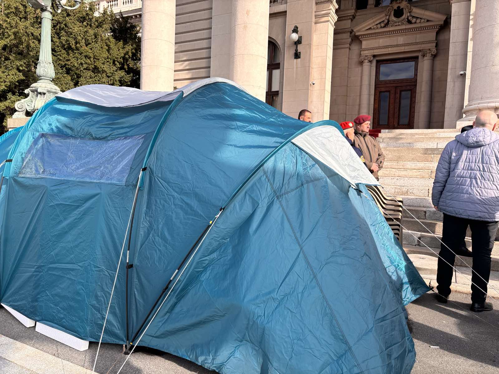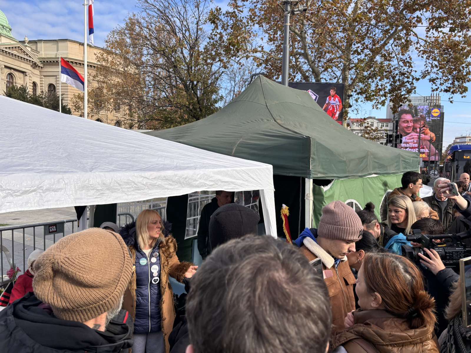 Majka Stefana Hrke, mladića koji je stradao u padu nadstrešnice, treći dan štrajkuje glađu ispred Skupštine Srbije. Pristigli građani i poslanici opozicije joj pružaju podršku, dok policija obezbeđuje prostor oko belih šatora