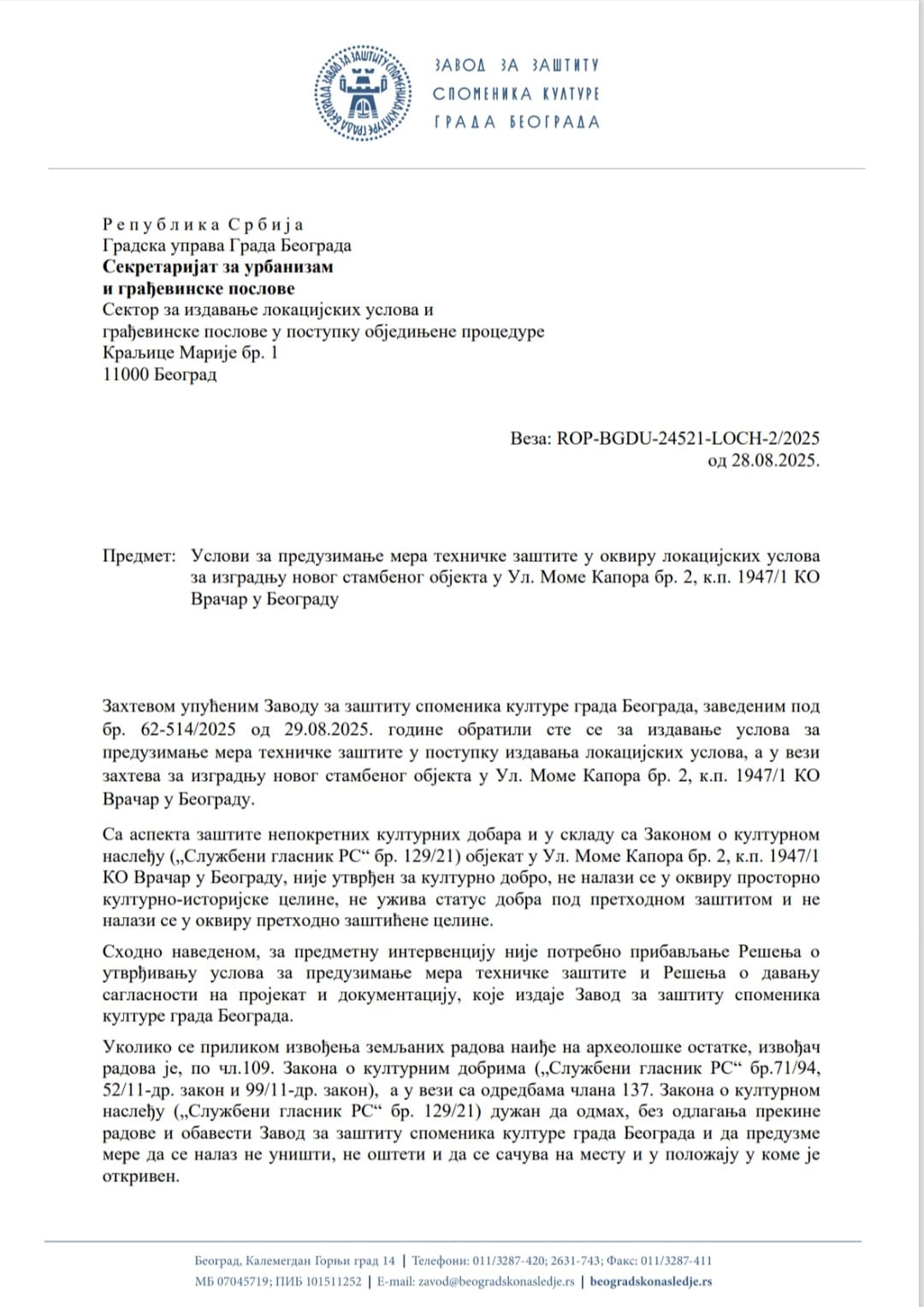 Shodno tome, „nije potrebno pribavljanje Rešenja o utvrđivanju uslova za preduzimanje mera tehničke zaštite i Rešenja o davanju saglasnosti na projekat i dokumentaciju koju izdaje Zavod za zaštitu spomenika kulture grada Beograda“.