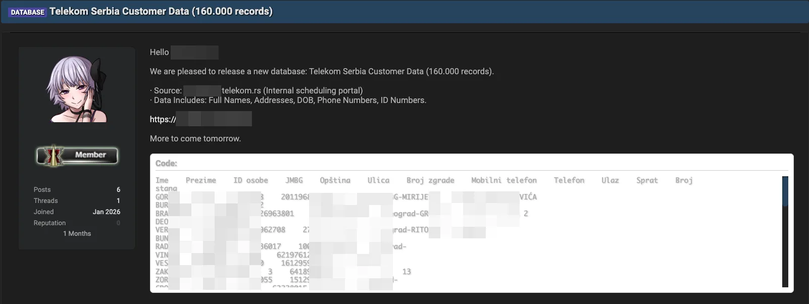 Hakerskim napadom na korisničku bazu Telekoma Srbija ukradeni su podaci 160.000 korisnika, objavljeno je na sajtu dailydarkweb. Navodi se da su neidentifikovani počinioci nedavno objavila bazu podataka na mreži, tvrdeći da su informacije ukradene sa internog portala Telekoma Srbija.