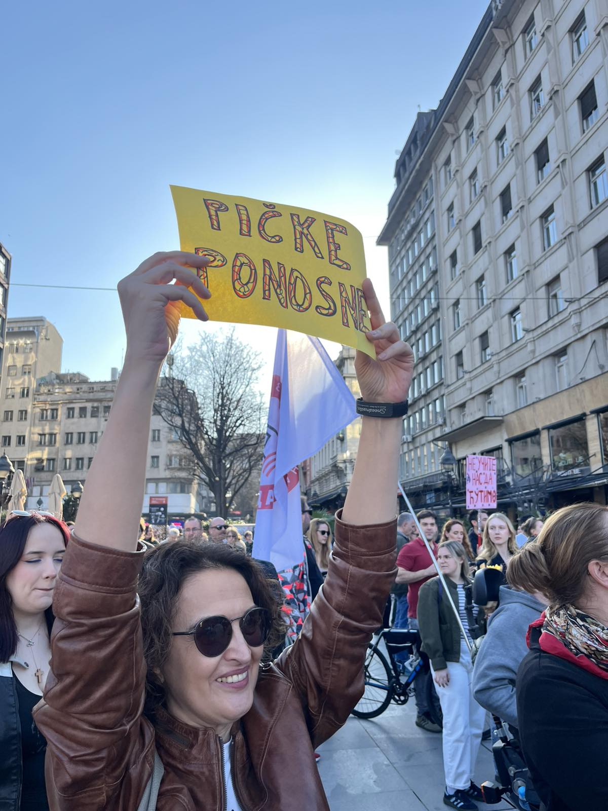 Okupljeni građani ističu da žene imaju pravo da glasaju i budu birane, odnosno da koriste i aktivno i pasivno biračko pravo, te poručuju da skupom pružaju podršku studentima i njihovim zahtevima.