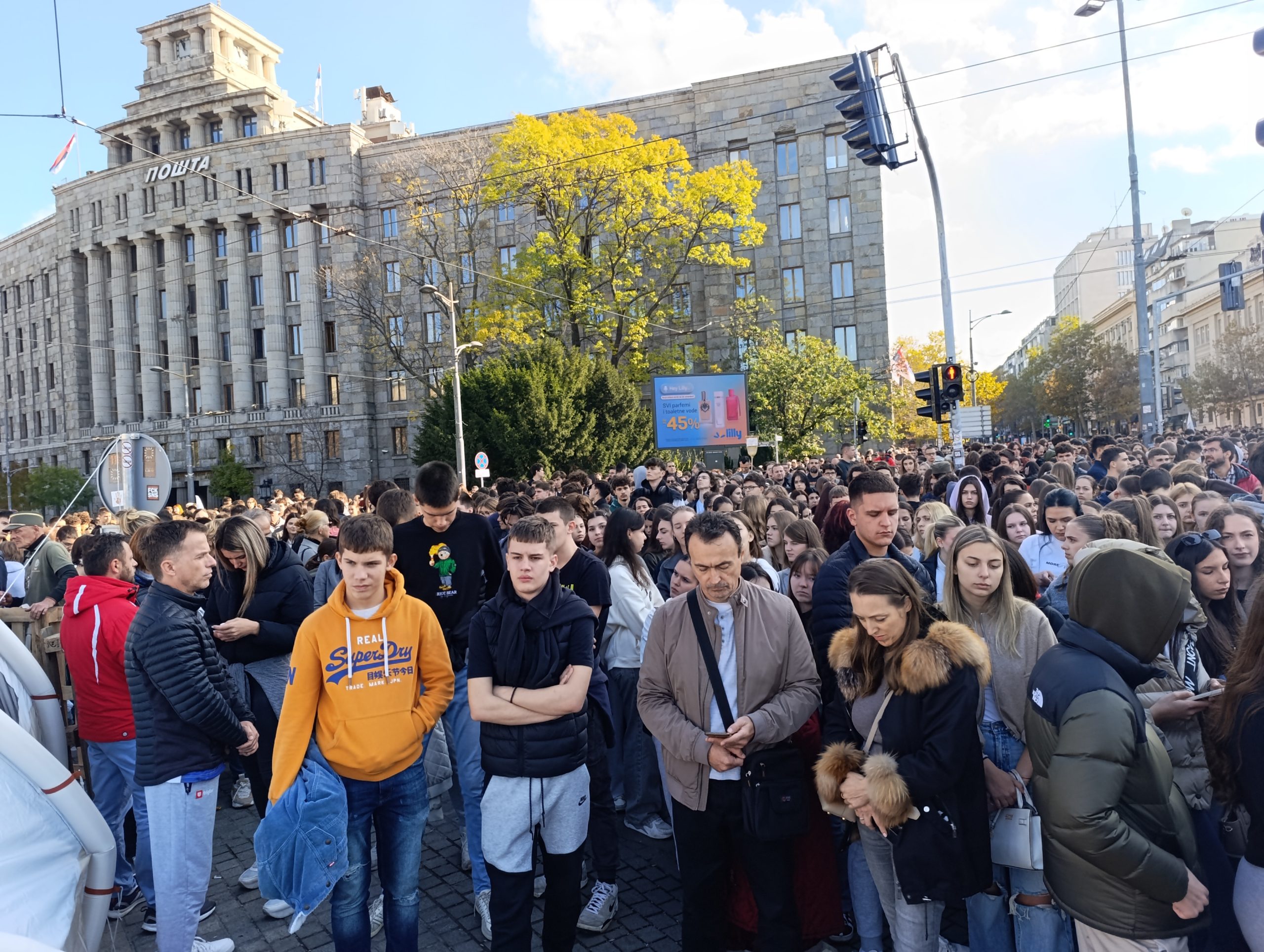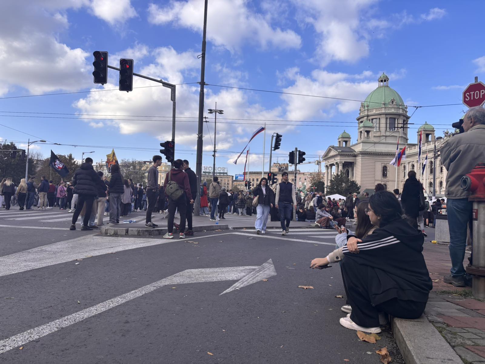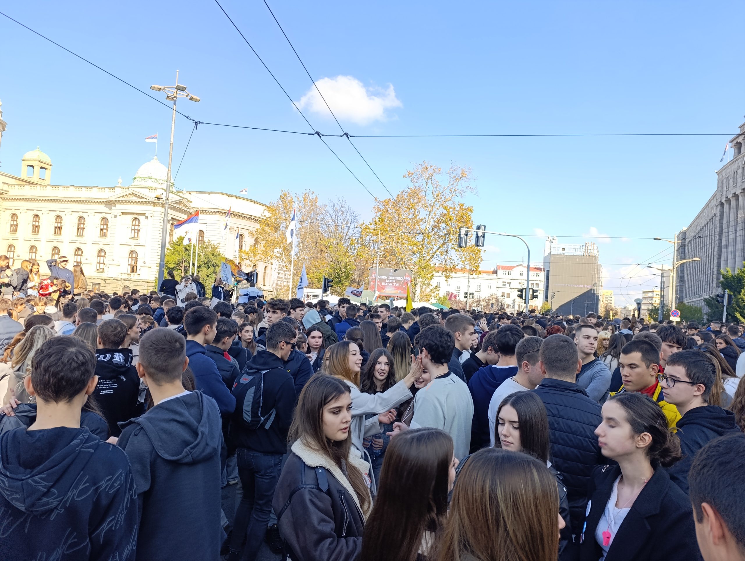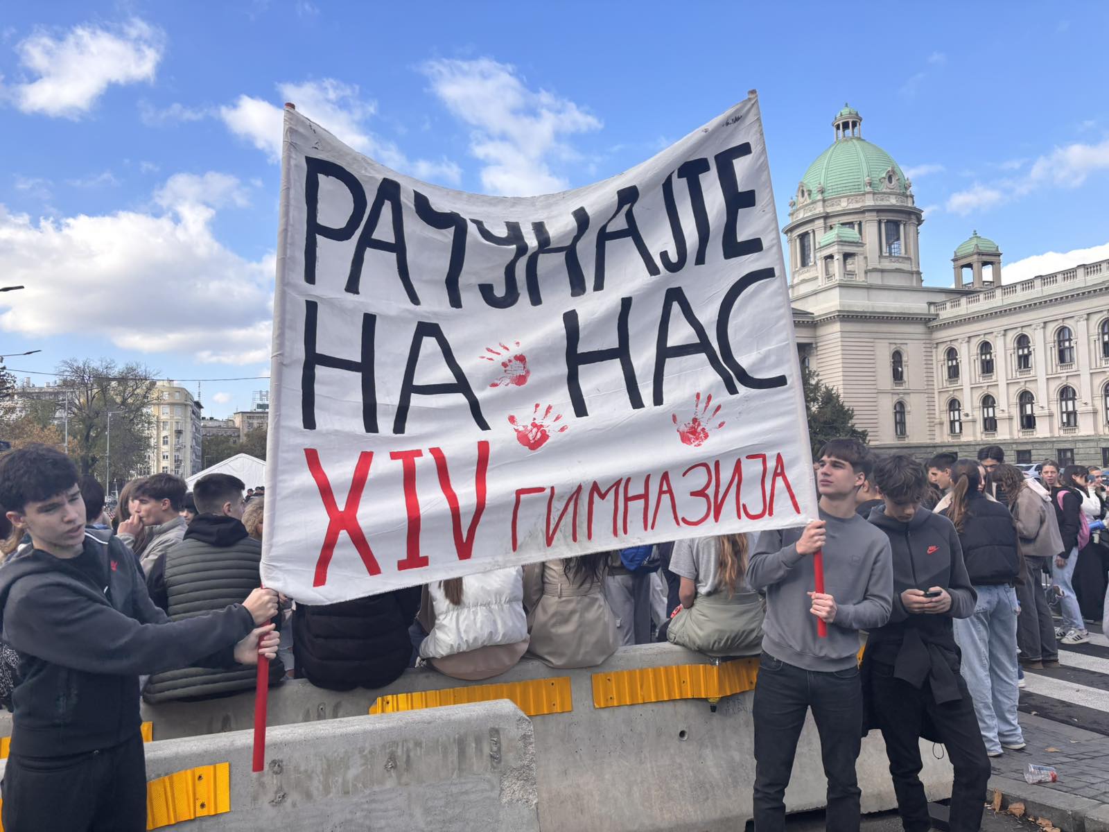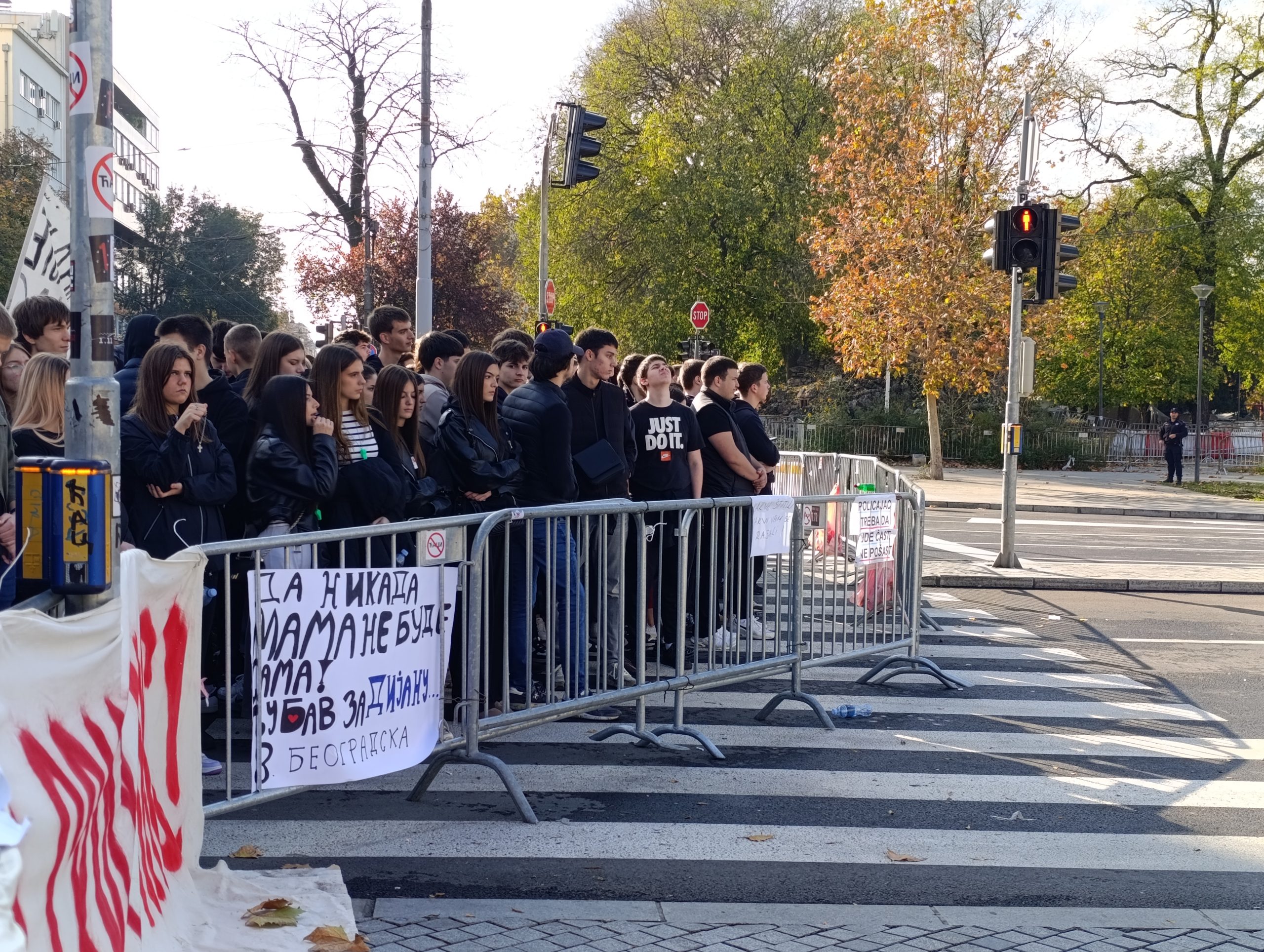 Veće grupe srednjoškolaca došle su iz pravca Takovske ulice i Bulevara kralja Aleksandra da podrže Dijanu Hrku, čiji je sin Stefan Hrka poginuo u padu nadstrešnice Železničke stanice u Novom Sadu 1. novembra prošle godine.