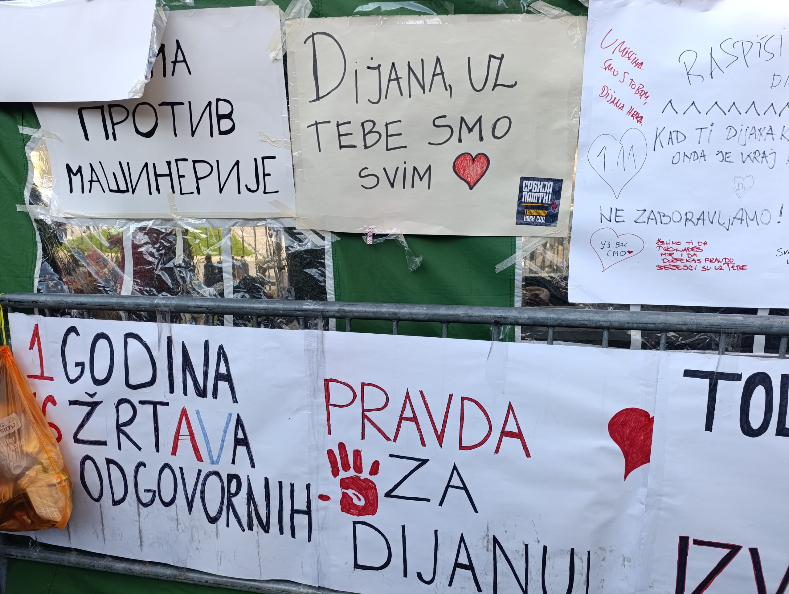 Na metalnoj ogradi koja deli šatorsko naselje, u kome su pristalice režima, i građane koji podržavaju Hrku okačen je transparent na kom piše „Dijana je majka svih nas“.
