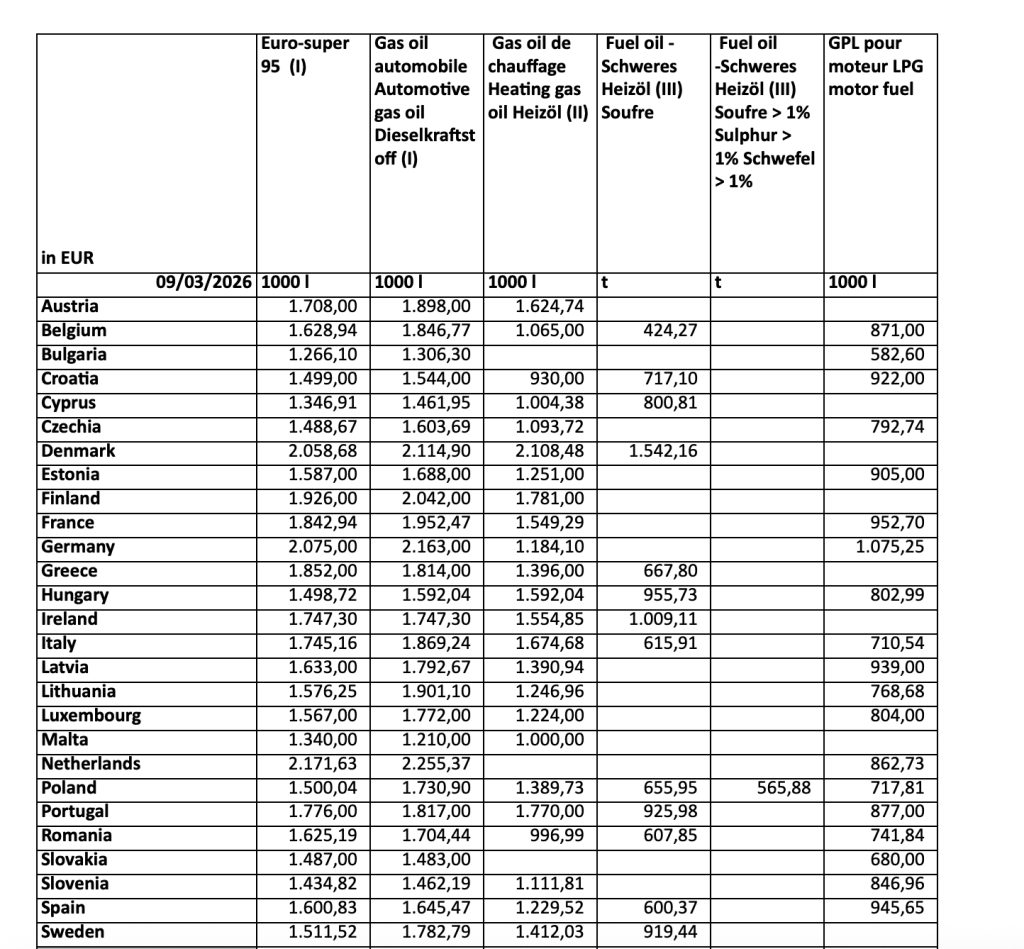 Evropska komisije svakog četvrtka objavljuje naftni bilten, radi poboljšanja transparentnosti cena nafte i jačanja unutrašnjeg tržišta, u kojem prikazuje nedeljne potrošačke cene na pumpama u zemljama EU, sa sve akcizama i drugim taksama.