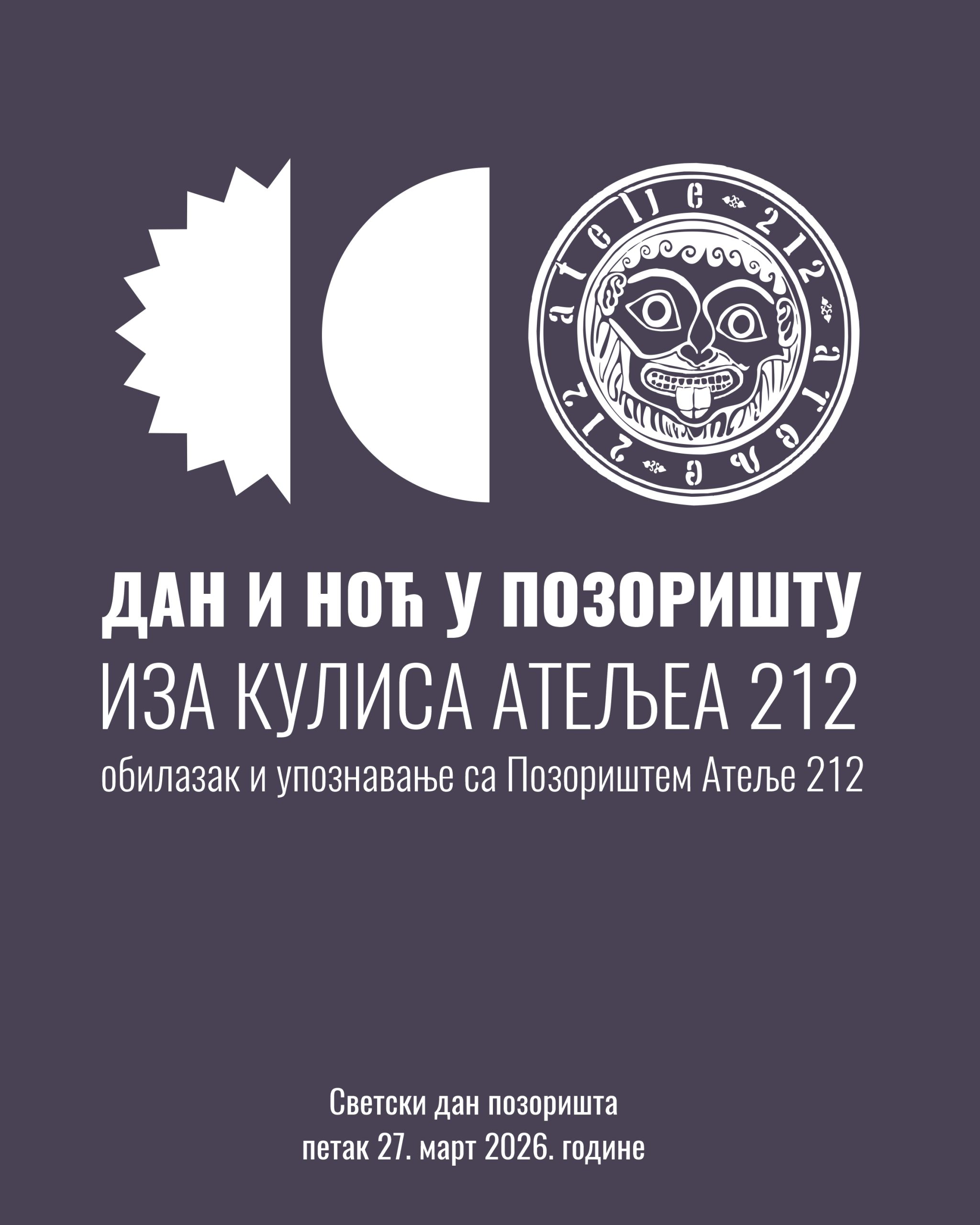Povodom Svetskog dana pozorišta, u petak 27. marta 2026. godine, Atelje 212 otvara svoja vrata za sve zainteresovane, sa željom da publika otkrije i upozna poznate i nepoznate prostore ovog pozorišta.