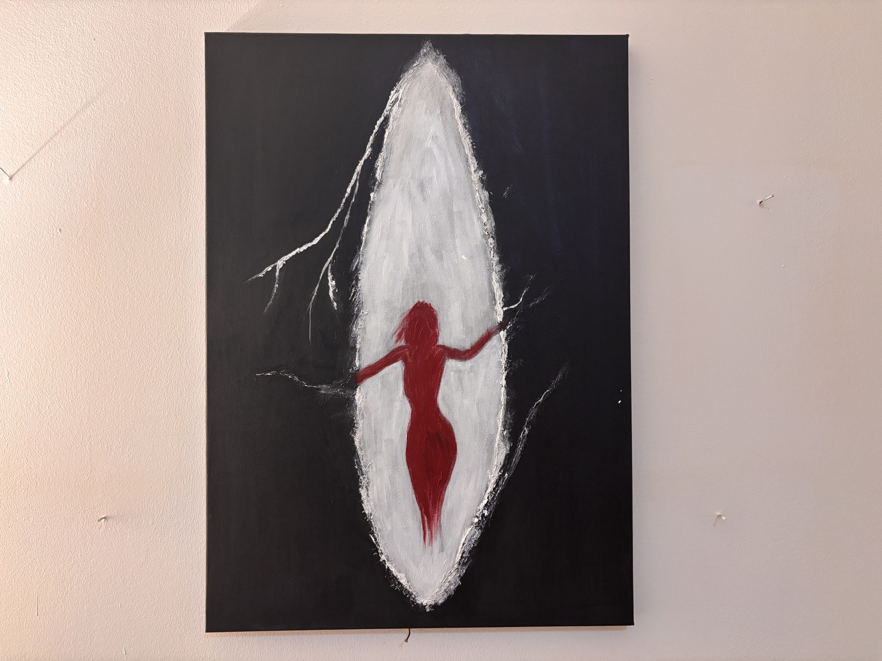 „Sve je krenulo tako što sam za vreme pandemije korona virusa 2020. otišla u radnju, kupila štafelaj, nekoliko platna i samo tri boje – crnu, belu i crvenu. Upravo su te tri boje predstavljale ono kako sam se u tim momentima osećala“, kaže Katarina Stevanović.