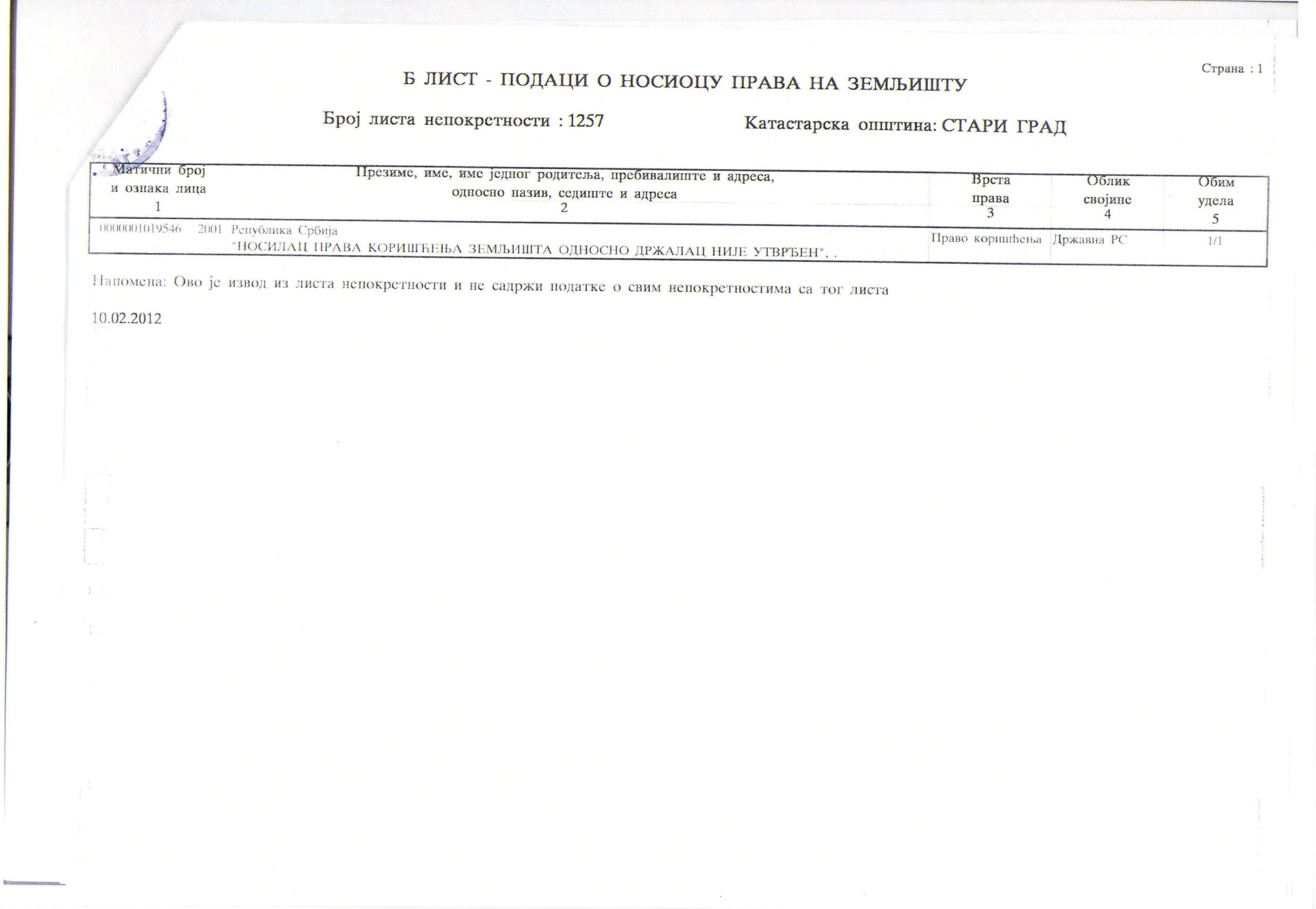 Zna se da 10. februara 2012. godine prema Katastru nepokretnosti „nosilac prava korišćenja zemljišta odnosno držalac nije (bio) utvrđen“.