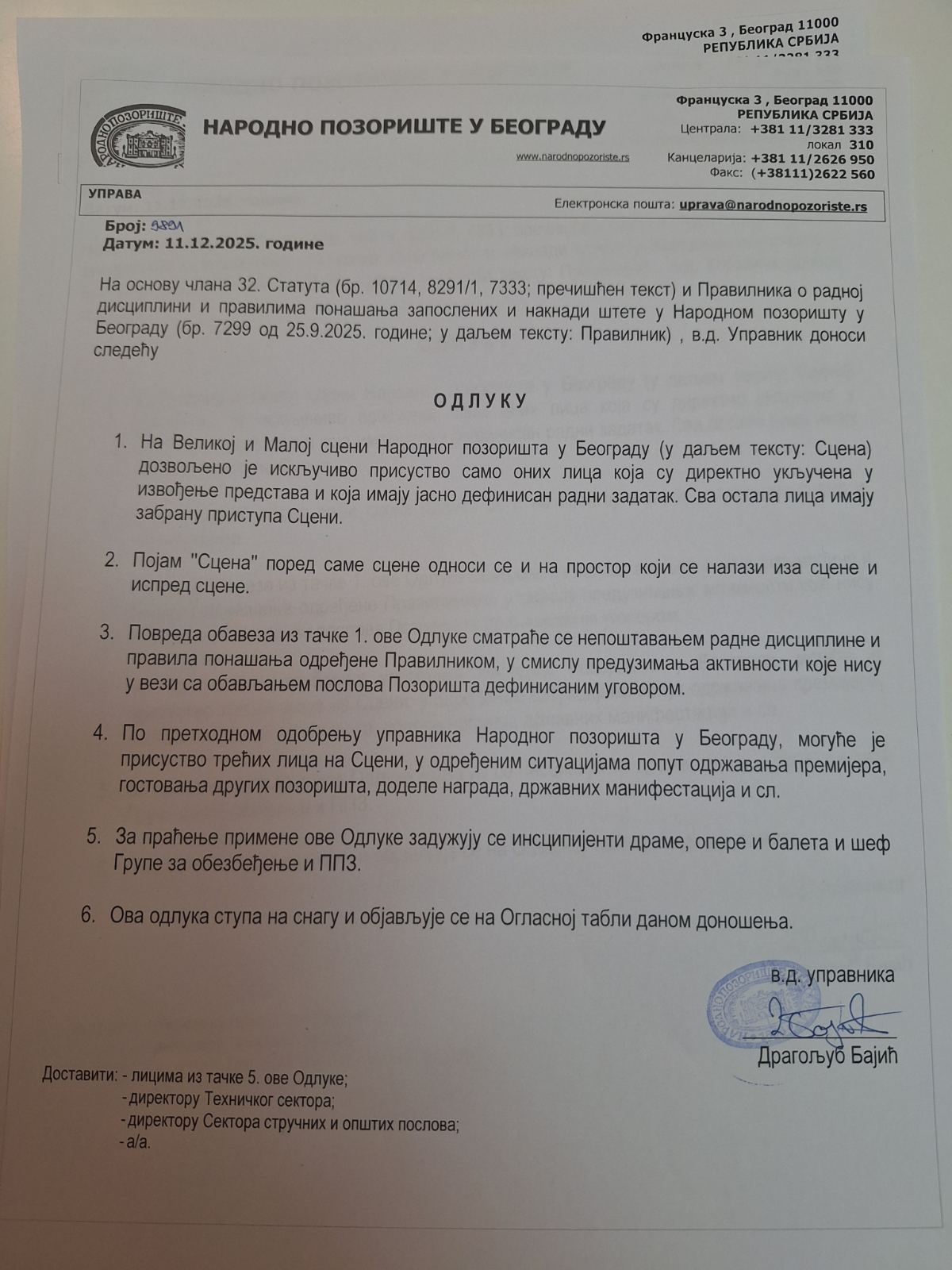 „Za sprovođenje odluke biće zaduženi inspicijenti Drame, Opere i Baleta, kao i šef Grupe za obezbeđenje i PPZ“, piše.