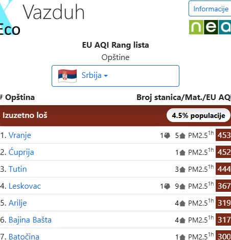 Prema podacima sa sajta xeco.info ovog jutra najveća koncentracija zagađenja je u Vranju, Ćupriji, Tutinu, Leskovcu, Arilju, Bajinoj Bašti i Batočini.