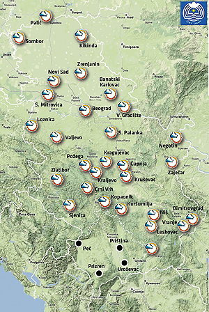 Tokom bombardovanja 1999. na Kosovu su srušene sve četiri glavne meteorološke stanice – u Prištini, Peći, Prizrenu i Uroševcu. Danas državna meteorološka služba, Republički hidrometeorološki zavod Srbije, ima 28 glavnih meteoroloških stanica. To su Palić, Sombor, Novi Sad, Zrenjanin, Kikinda, Banatski Karlovac, Loznica, Sremska Mitrovica, Valjevo, Beograd, Kragujevac, Smederevska Palanka, Veliko Gradište, Crni Vrh, Negotin, Zlatibor, Sjenica, Požega, Kraljevo, Kopaonik, Kruševac, Ćuprija, Niš, Leskovac, Zaječar, Dimitrovgrad i Vranje. Podaci o temperaturi, pravcu i brzini vetra, vlažnosti i toplotnom indeksu, po pravilu se očitavaju svakog sata. Svi oni se mogu pogledati na sajtu www.hidmet.gov.rs gde se pored toga nalaze i prognoze, sinoptičke karte, satelitski i radarski snimci, i mnogo drugog o klimi i vremenu nad Srbijom. Podaci sa automatskih mernih stanica se ažuriraju svakog minuta.
