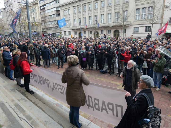 Sudije i tužioci iz cele Srbije okupili su se ispred Ustavnog suda u Beogradu na protestu protiv političkih pritisaka na pravosuđe, povodom sprečavanja tužiteljke da izvrši uviđaj nakon incidenta u šatorskom naselju ispred Skupštine.