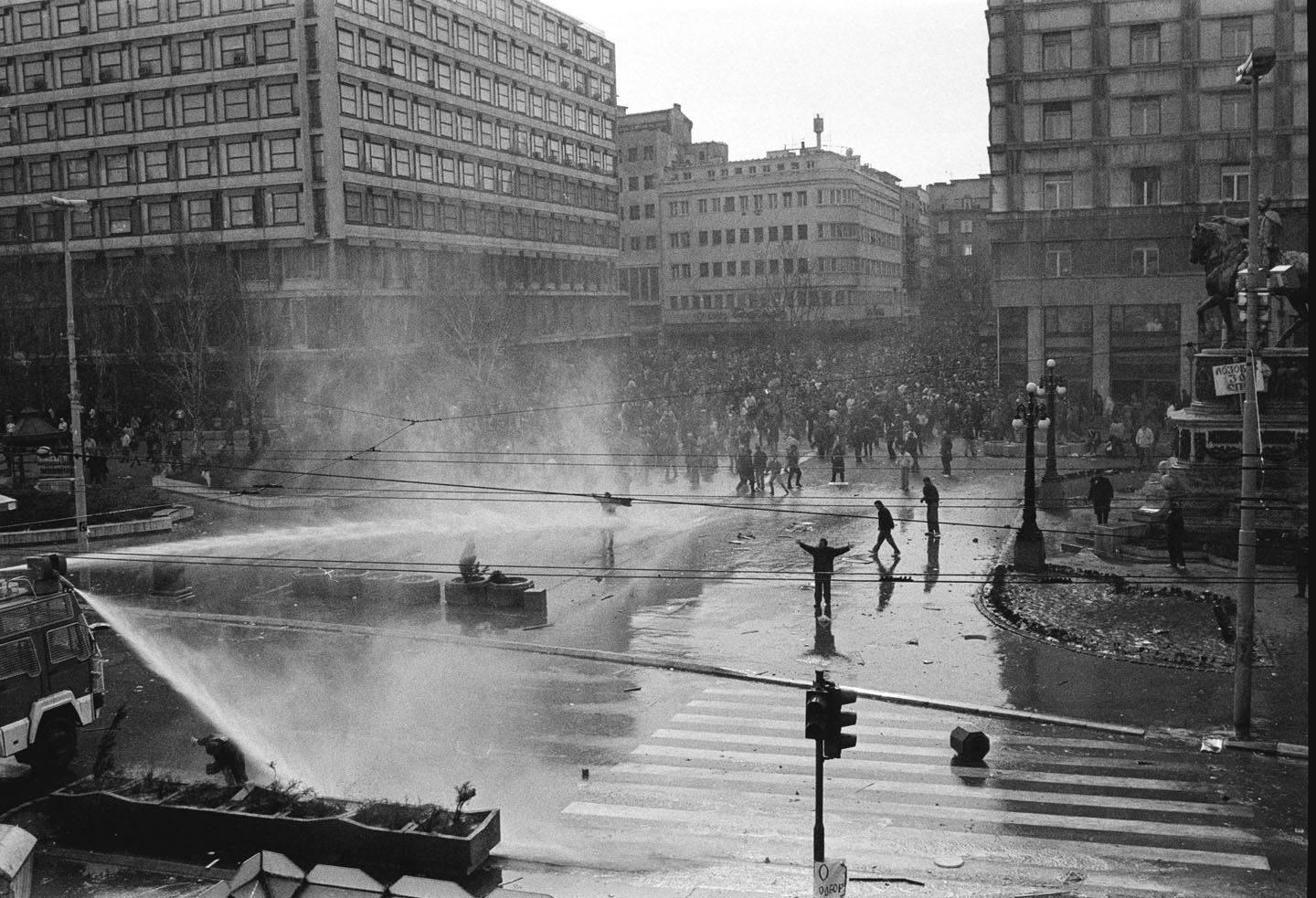 „Samo što je miting počeo, oko 12.35, operativci u civilu ubacili su u sredinu mase na Trgu Republike nekoliko punjenja suzavca CS. Milicija je tada već imala ceo Trg Republike opkoljen sa svih strana i gusto popunjen već nervoznom masom. Oficiri milicije, kako ćemo kasnije saznati, bili su protiv takvog taktičkog pristupa, poučeni iskustvom i zdravim razumom; neki od njih otkazali su poslušnost, videvši kuda vode takva naređenja, kao što se (opet kasnije) doznalo iz snimaka milicijskih radio-veza.