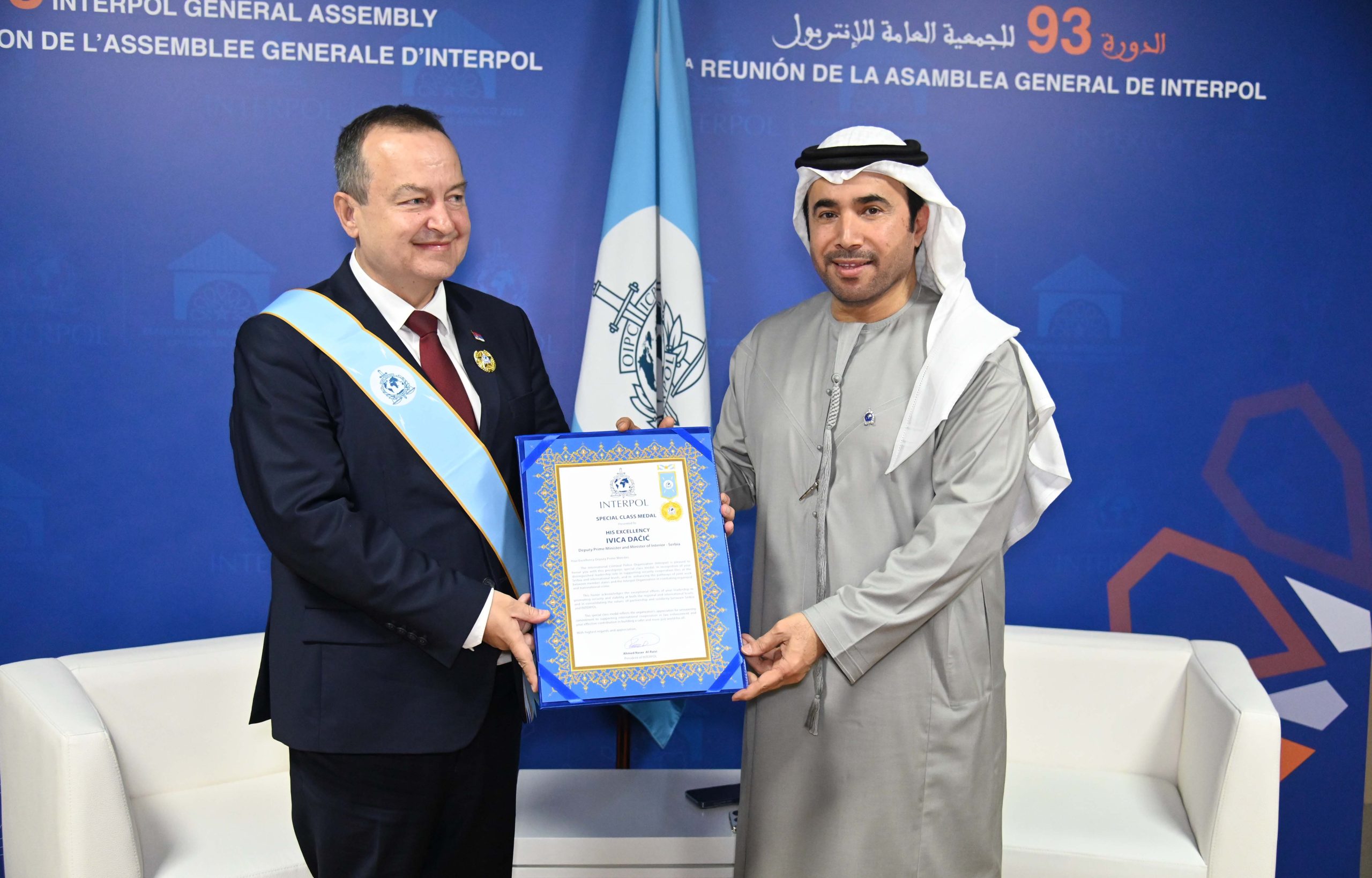 „Ovo odlikovanje potvrđuje izvanredne rezultate Vašeg rukovodstva u očuvanju bezbednosti i stabilnosti na regionalnom i globalnom planu, kao i u učvršćivanju vrednosti partnerstva i solidarnosti između Republike Srbije i Interpola. Medalja posebnog ranga predstavlja izraz iskrene zahvalnosti ove organizacije za Vašu nepokolebljivu posvećenost unapređenju međunarodne saradnje u oblasti sprovođenja zakona i za Vaš delotvoran doprinos izgradnji bezbednijeg i pravednijeg sveta za sve“, navodi se u prestižnom priznanju Interpola koje je ministru Dačiću uručio predsednik Interpola Ahmed Naser Al-Raisi.