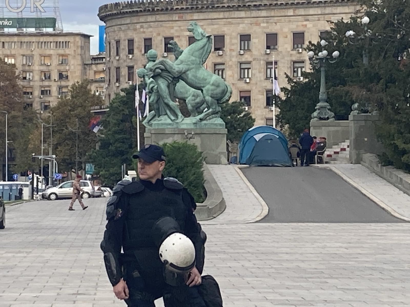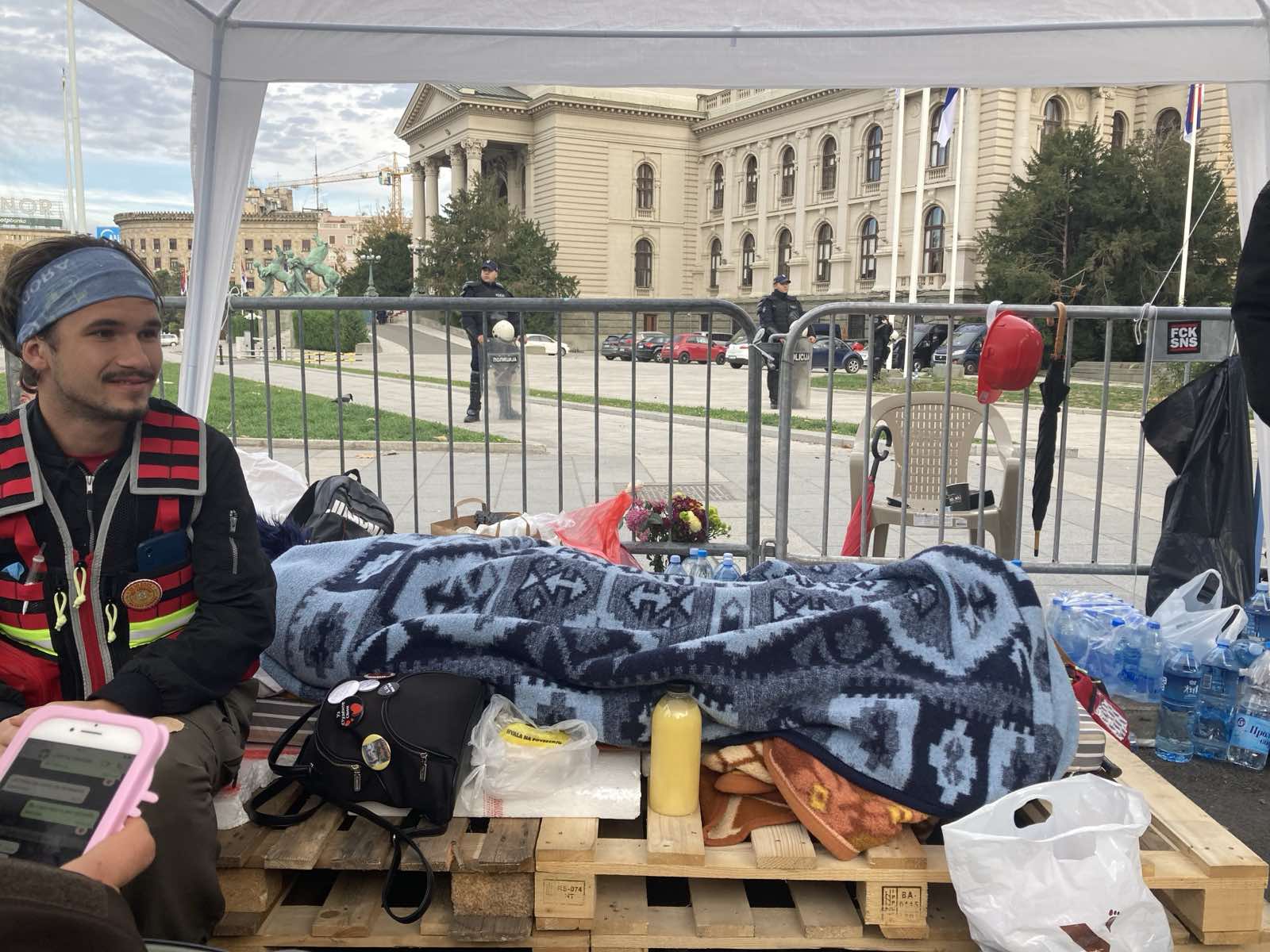 Direktno ispred stepeništa Narodne skupštine takođe su podignuti šatori ispred kojih sede ljudi sa crvenim beretkama.