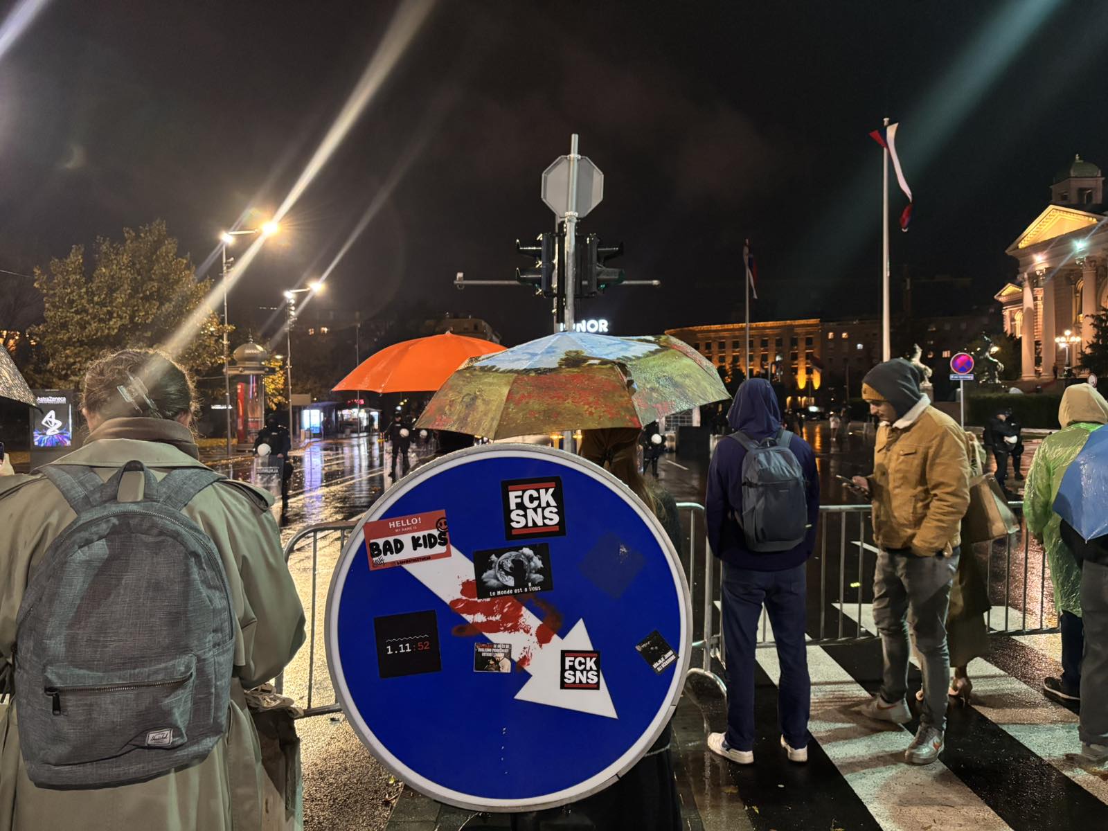 Nekoliko desetina policajaca u kabanicama i sa kapama čuva dvadesetak okupljenih pred zgradom najznačajnijeg zakonodavnog tela u državi, zgradom Narodne skupštine.