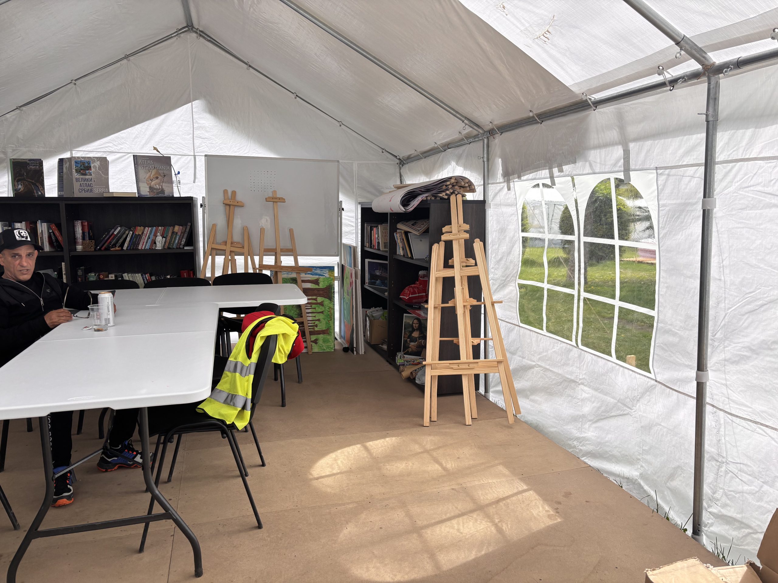 Muškarca koji me je zamolio da ne fotografišem poznajem od ranije. Bio je čuvar improvizovane biblioteke u Ćacilendu još u aprilu, kada sam prvi put posetila ovo šatorsko naselje.