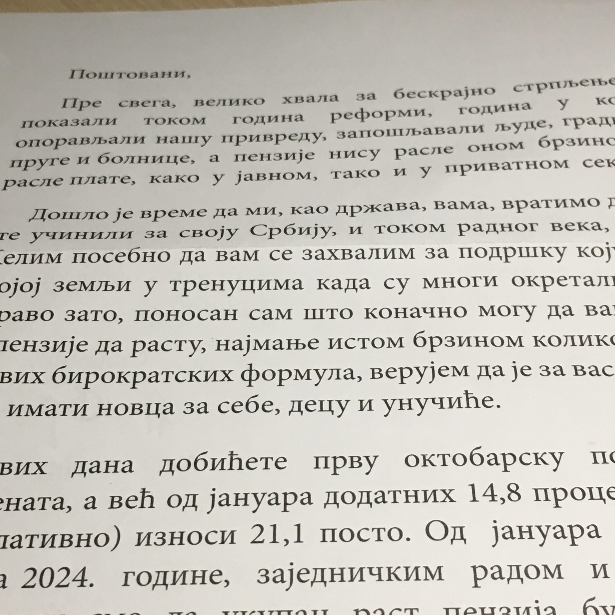 Unutra, jedan list. Okrenem drugu stranu da konačno saznam ko mi piše, kad tamo – A. Vučić. I postane mi sve jasno, bez da sam pročitala pismo: da mi predsednik države piše zato što sam penzionerka i zato što očekuje da glasam za njega jer on je meni povećao penziju pa je red da mu to uzvratim na izborima u decembru. I, postane mi mučno.