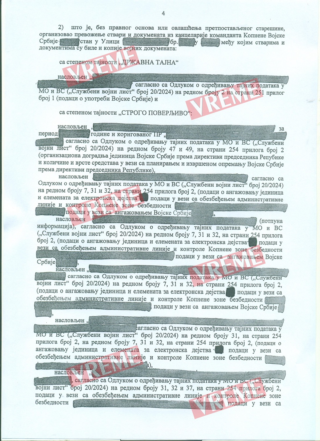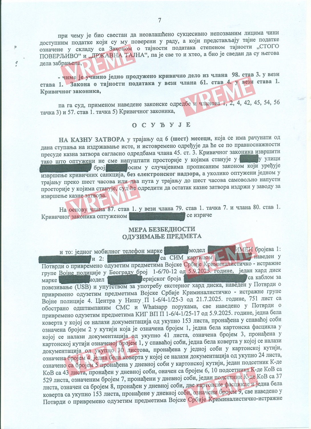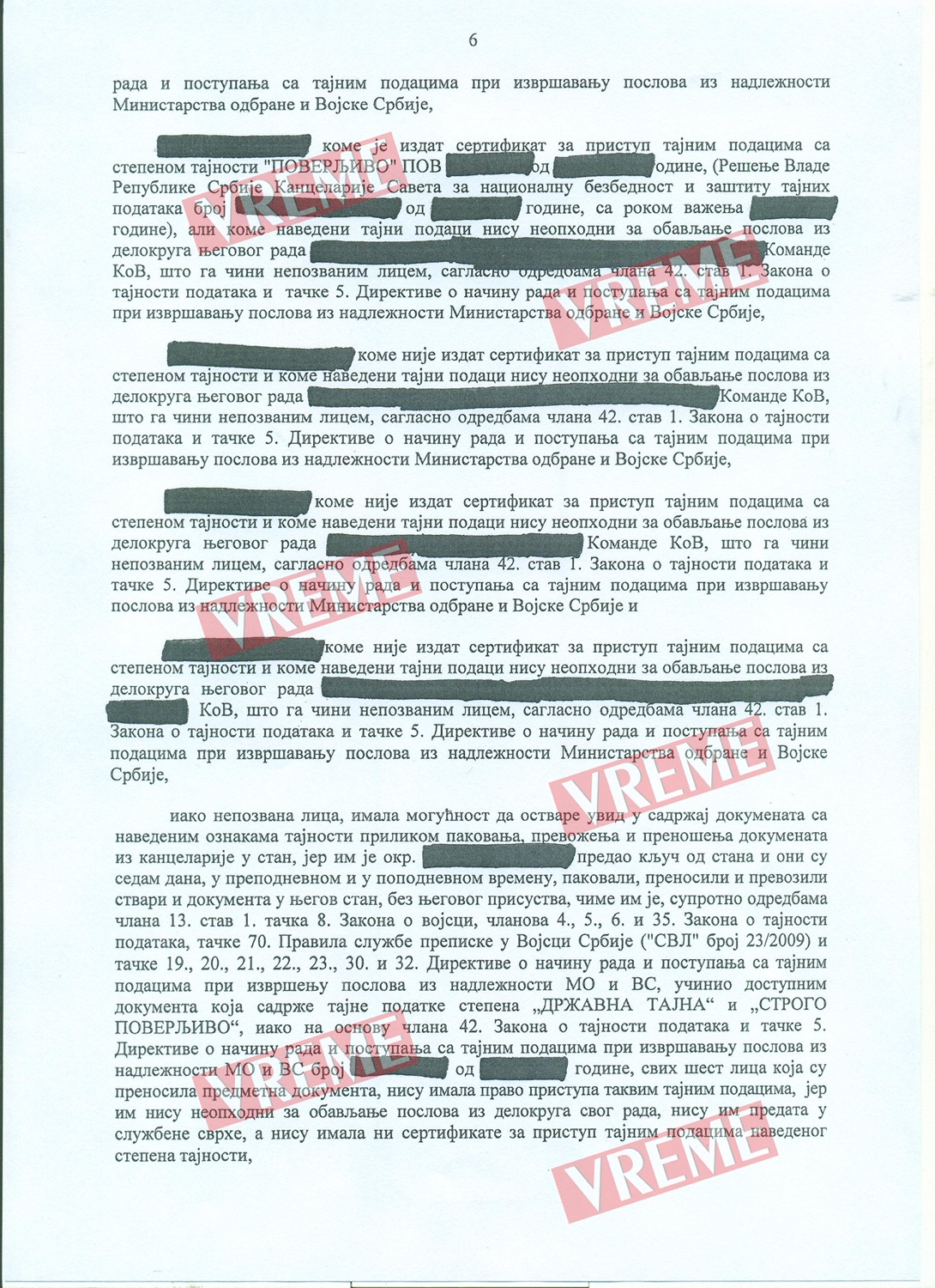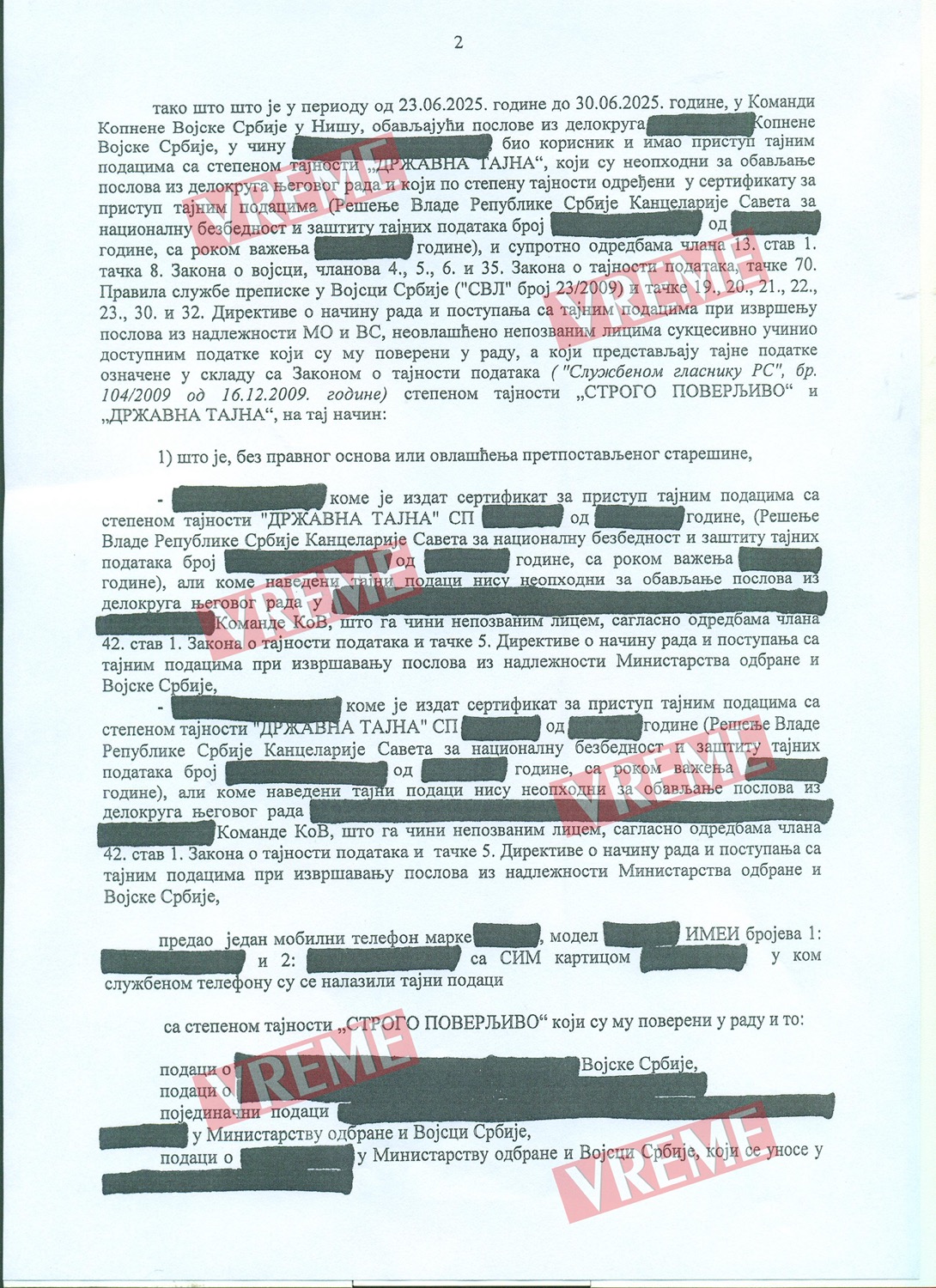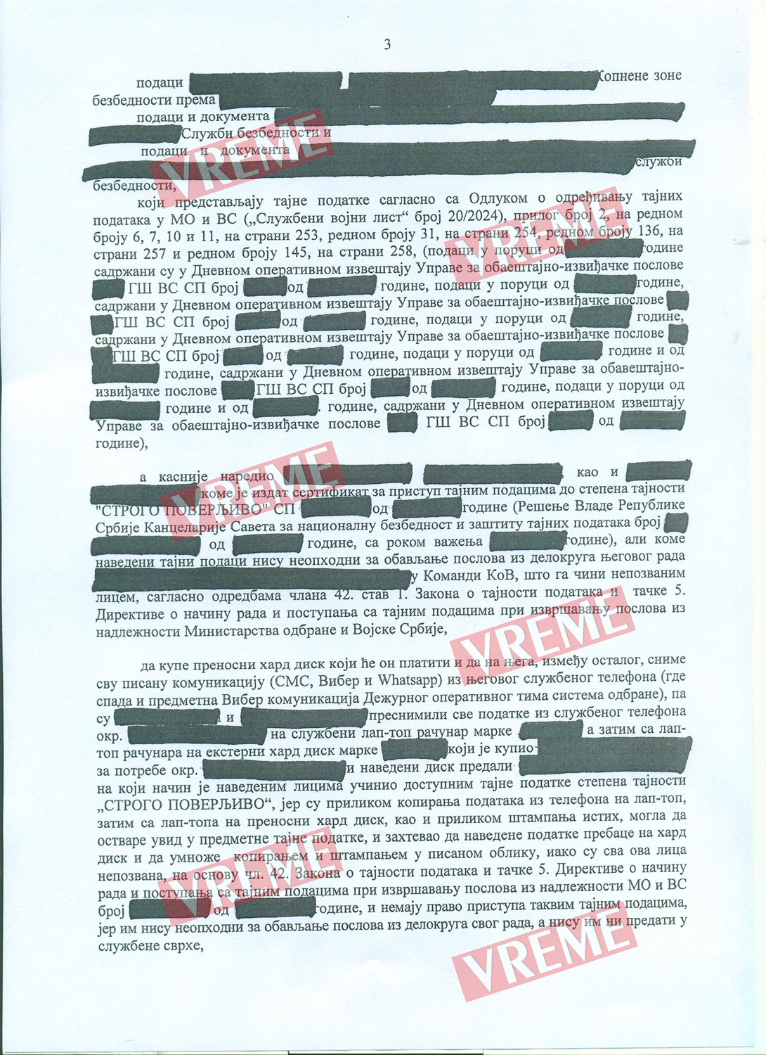 U dokumentu koje je „Vreme” dobilo zamrčeni su pojedini delovi, pa se ne može videti o kojim je tačno podacima reč, niti kome ih je optuženi predao.