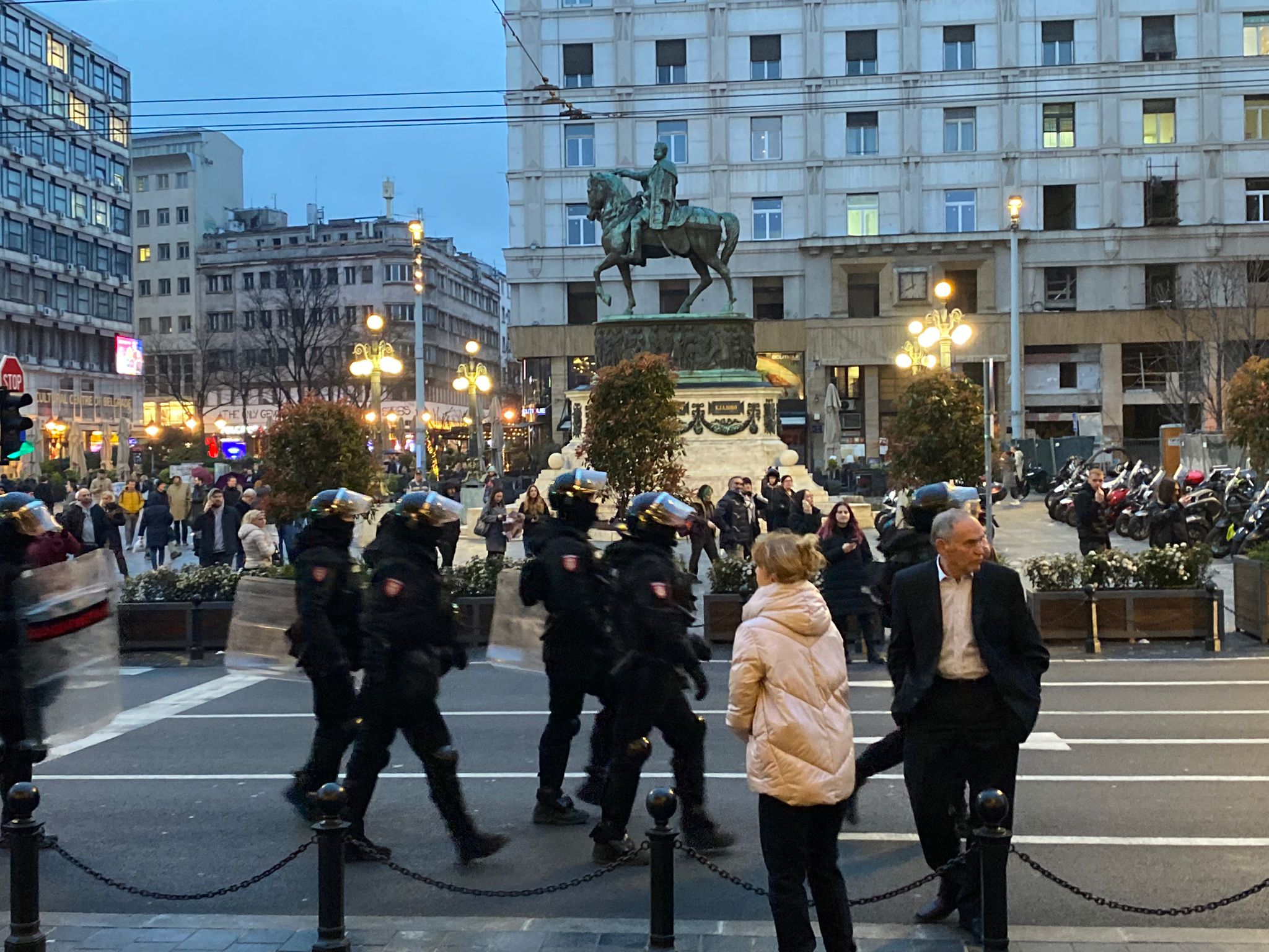 Nakon nadguravanja sa policijom ispred Rektorata, pripadnici Policijske brigade povukli su se ka Trgu Republike, gde su ih sledili građani uz povike „1312, sluge okupatora“, „av, av“ i „kerovi“.