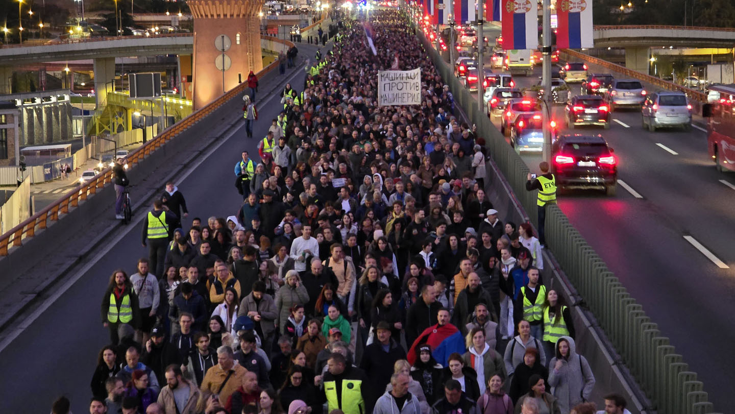 Studetni i građani su u komemorativnoj šetnji prešli most Gazela, kod Sava centra dočekuju ih građani sa upaljenim blicevima, a učesnici povorke su im odgovorili na isti način.