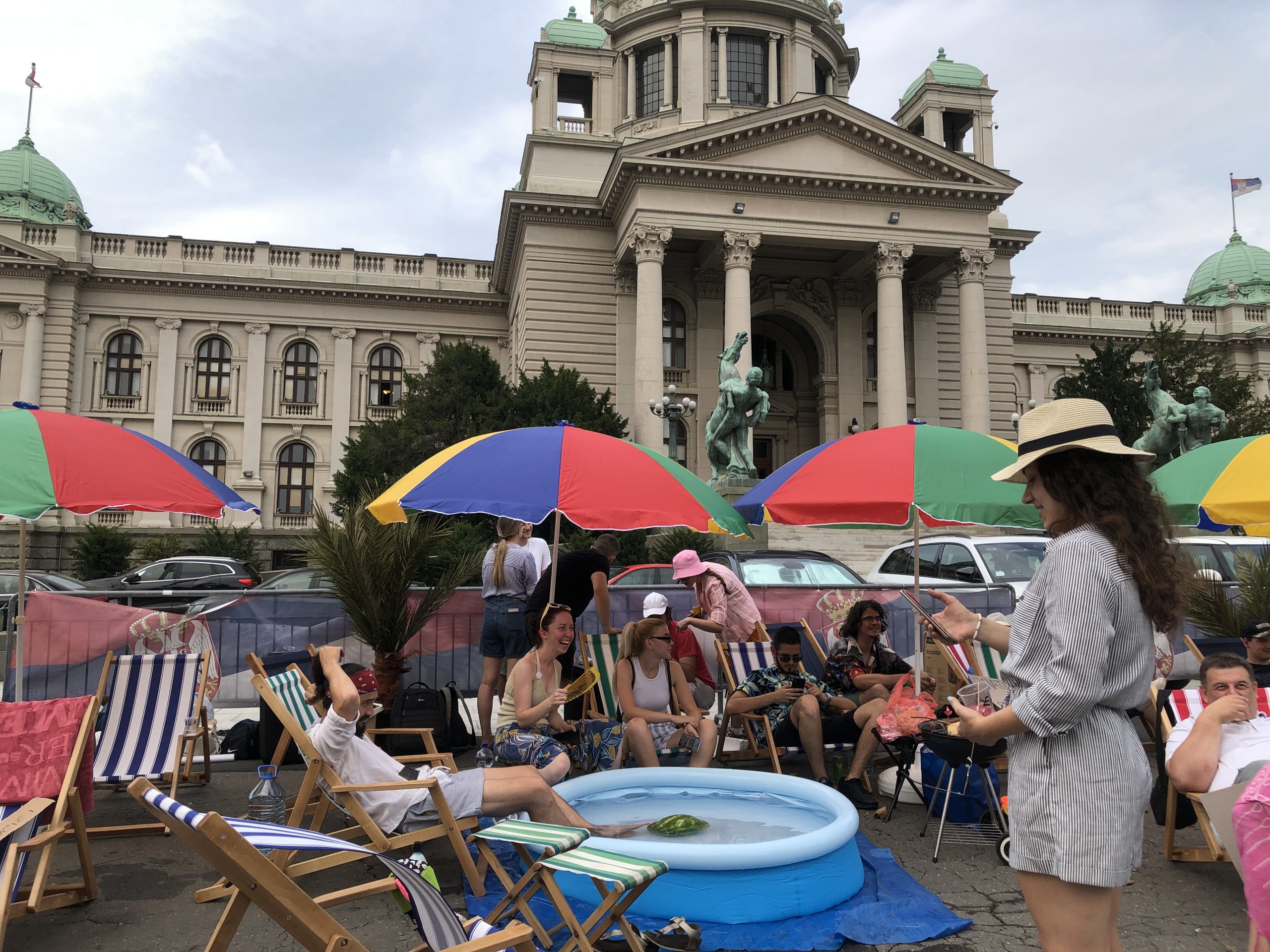 “Platili smo domove, pa nemamo za more” stoji na transparentima koje su studenti pokazivali prolaznicima ispred Narodne skupštine. Ko je stao da se malo odmori na šarenim ležaljkama, mogao je da se uveri da je sve baš kao na letovanju. Studenti su doneli roštilj na kome su se pekli ćevapi, frizbi i lopte za odbojku, a za one kojima je bilo najvrelije našao se bazen napunjen vodom.