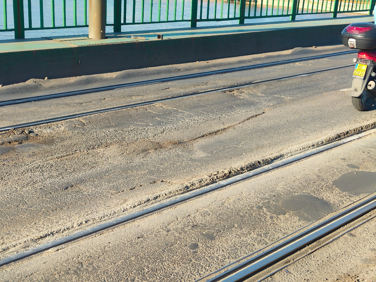 Ulegao i popucao asfalt. Ispod rupa na asfaltu vidi se metalna podloga. Metalna konstrukcija zarđala i popucala, a u trenutku kad preko njega prelazi tramvaj, ceo Stari savski most se trese. Šta više, kad se na most dolazi iz pravca Karađorđeve ulice, trotoar kojim se dolazi na most je desetak centrimetara potonuo.