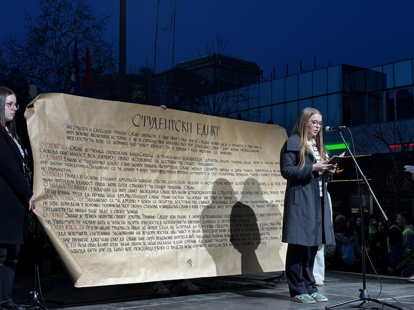 Posle obraćanja maratonaca, na binu se popela studentkinja sa Prirodno-matematičkog fakulteta da pročita studentski edikt koji je donet upravo u Nišu pre godinu dana.
