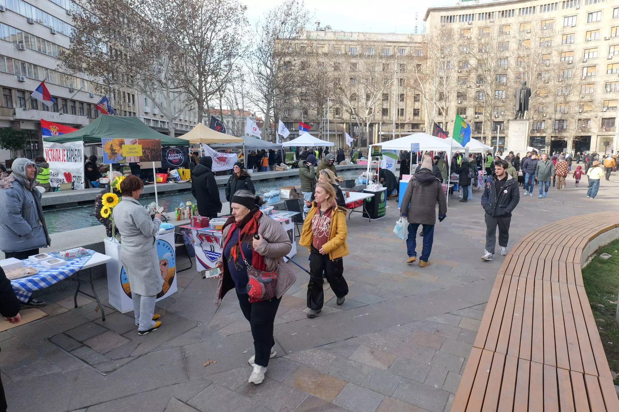 Na Trgu Nikole Pašića postavljen je veliki broj štandova Zborova, Društvenog fronta i različitih fakulteta.