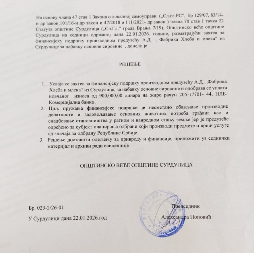 U rešenju Opštinskog Veća Surdulice od 22. januara – dakle pre stravične nesreće – navodi se da je cilj finansijske podrške „nesmetano obavljanje proizvodne delatnosti i zadovoljavanje osnovnih životnih potreba građana kao i snabdevanja stanovništva u ratnom i vanrednom stanju“jer baš ta pekara „proizvodi predmete i vrši usluge od značaja za odbranu Republike Srbije“.