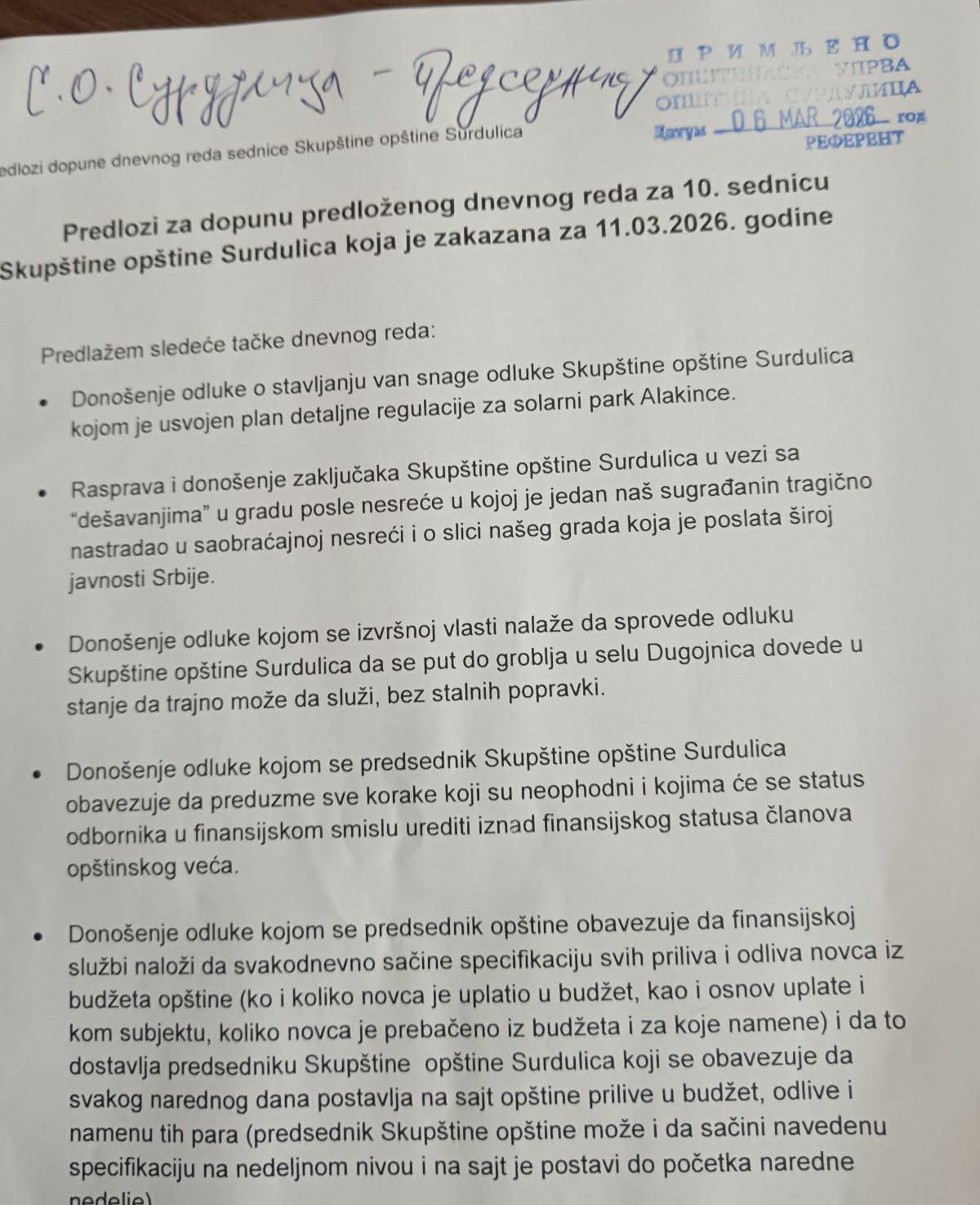 Odbornik opozicione liste „Možemo i moramo bolje za spas Surdulice“ Ljubiša Ranđelović traži da lokalna skupština raspravlja o dešavanjima u varoši nakon pogibije Rastka Jovića u saobraćajnoj nesreći (9. februar).