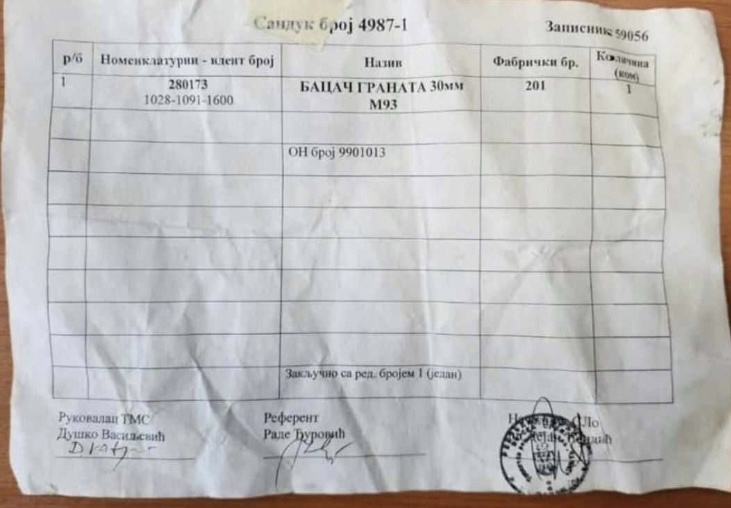 zapisnikZapisnik broj 59056 sa sanduka u kome je bio smešten automatski bacač granata.