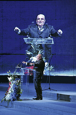 Palma nastavi da predsedava, pozdravi Dačića, Krkobabića, Jeremića, Kalanovićku, ministra Obradovića, ministra Škundrića, Sašu Antića, još jednog Krkobabića, Batića, Mehu Omerovića, tu čestita Bajram, zatraži veliki aplauz za našu braću. Bi veliki aplauz, nastavi se veliki aplauz, Palma poimence i sve čitajući pozdravi ambasadore, Rusije, Velike Britanije, Nemačke, Švedske, vojnog oficira SAD, ambasadore Australije, Tunisa, Brazila, Alžira, Kube, Makedonije, otpravnika poslova ambasade Belorusije, zamenika ambasadora Bugarske, predstavnika ambasade Austrije, na kraju reče, Dozvolite mi da pustimo film koji će trajati 10 minuta, da vidite kratku biografiju Jedinstvene Srbije. Aplauzi se sastaviše, pustiše film, bi kako Palma pobedio u Jagodini, jednom, drugi put, bi tigar iz zoo-vrta, bi akva-park, bi kako Palma govori o ekonomskom patriotizmu, bi kako pozdravlja Dačića, bi da je Jagodina grad budućnosti na čelu sa predsednikom Palmom, bi Palma u Moskvi, bi Palma u Parizu, Gračanici, bi Palma na moru i brodu, gde veli, Nalazimo se na mestu koje se zove Plava grobnica, i tu ćemo baciti cveće i vence… bi kraj filma, jopet ti aplauzi.