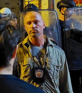 Igor Žmirić je često na ulici poslednjih meseci. Snimci ga pokazuju pred kordonima, sa policijskom legitimacijom oko vrata i flasterom na vratu. Ispod flastera se krije istetovirana ruža, simbol zloglasne Jedinice za specijalne operacije iz doba Milorada Ulemeka Legije.