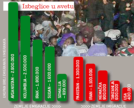 Prema izveštaju Komesarijata za izbeglice pri UN-u, u 2006. bilo je oko 20,8 miliona raseljenih lica na svetu (izbeglica, azilanata, interno raseljenih, lica bez državljanstava itd.). Emigracija iz Avganistana, Kolumbije, Iraka, Sudana i Somalije čini 46 odsto ukupne populacije izbeglica na svetu. Ovaj broj se znatno smanjuje poslednjih godina usled povećanja broja povratnika u domovinu (posebno Avganistanaca iz Pakistana i Irana). Srbija i Crna Gora su se našle na jedanaestom mestu po broju izbeglica, a BiH na sedmom. Karakteristično za Srbiju jeste da je na trećem mestu u svetu po broju zahteva za azil (za političku emigraciju) a podnose ih uglavnom lica sa Kosova.