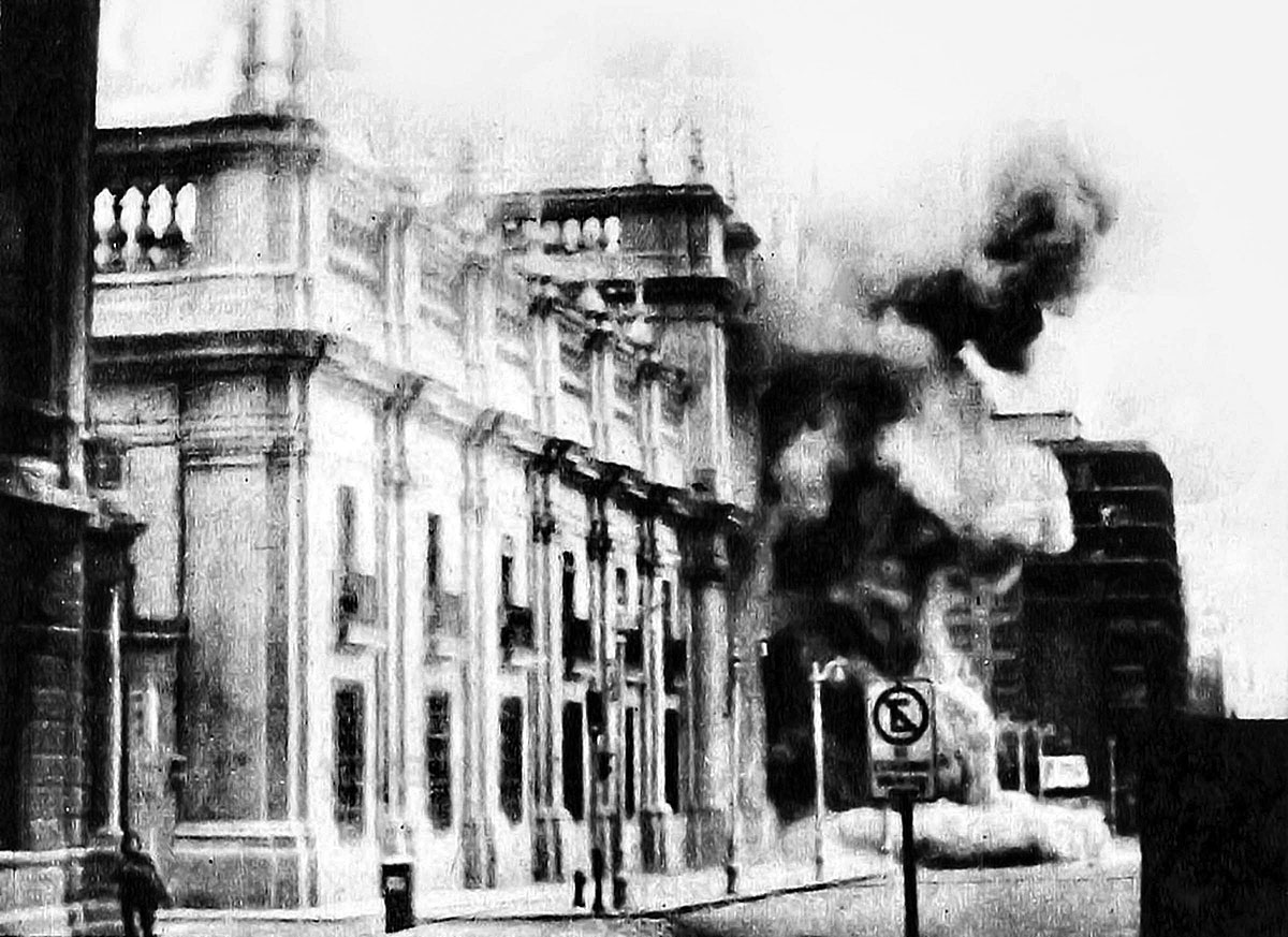 U 9.15 pučisti su počeli da pucaju iz tenkova na predsedničku palatu La Moneda, koju su napustile policijske i karabinijerske jedinice; branilo ju je oko 40 pripadnika Aljendeovog obezbeđenja i njegovih pristalica naoružanih automatima zajedno sa samim Salvadorom Aljendeom u jakni od tvida i sa automatom AK-47 u rukama (poklon kubanskog lidera Fidela Kastra).