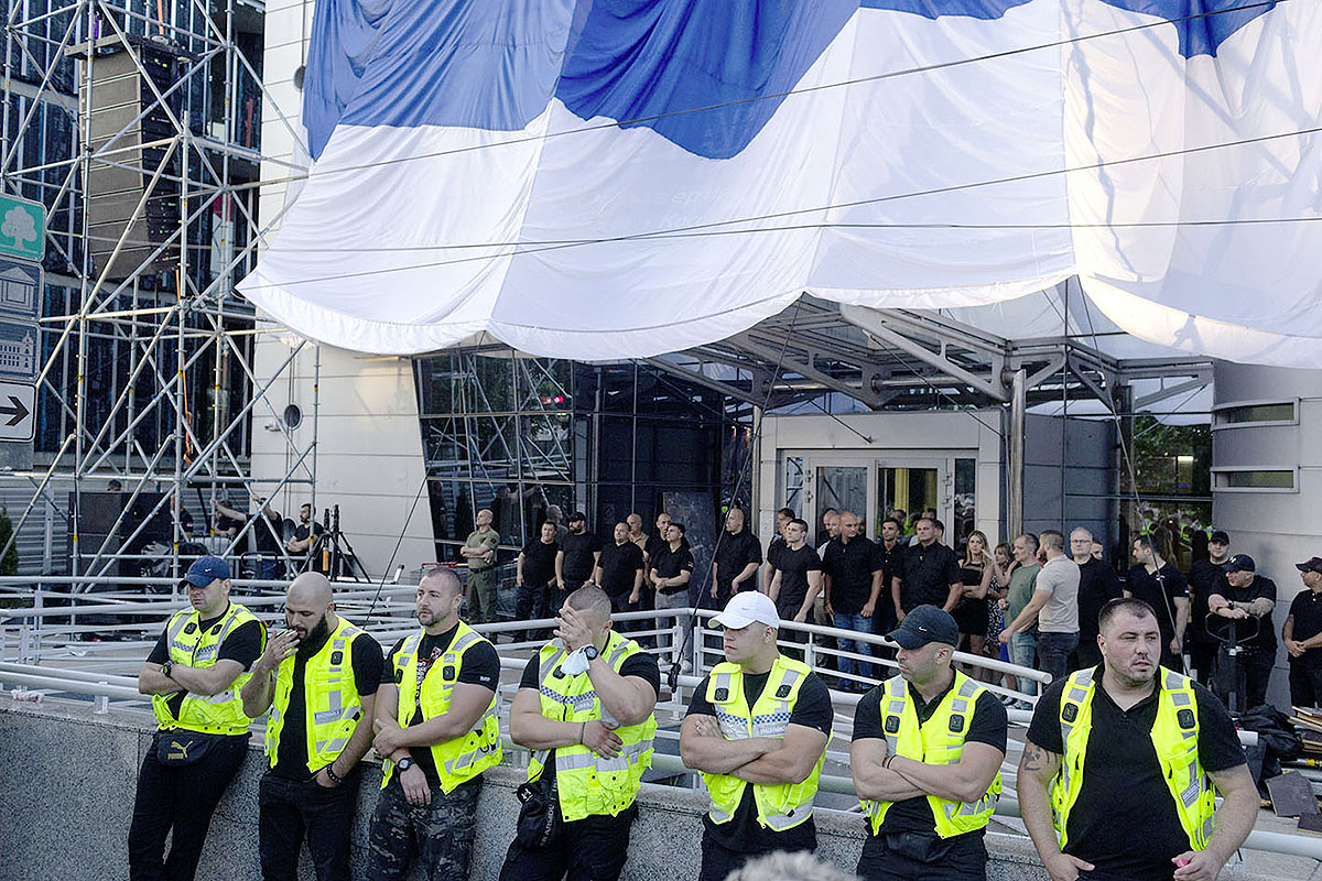 Zapravo sasvim očekivano, demonstrante je u subotu dočekala džinovska zastava Srbije, koja je prekrila pinkovsku sramotu i nelegalnu gradnju. Neke je opozicionare taj čin podsetio na izreku da je “patriotizam poslednje utočište hulja”. Sasvim uobičajeni deo ovog kolorita bili su i grubijani u crnim majicama koji su štitili zgradu, Mitrovićeva paravojska. Demonstranti su na zastavi projektovali lik Olivera Ivanovića, ubijenog lidera kosovske Građanske inicijative “Sloboda, demokratija, pravda”, čijoj je surovoj likvidaciji prethodio medijski linč na Pinku.