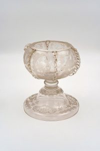 Veliki broj sačuvanih staklenih čaša sa grbom iz 19. veka pripisuje se proizvodnji staklare Avrama Petronijevića. Najčešće su to visoke, cilindrične, fasetirane čaše za vodu, presvučene crvenom lazurom, ređe žutom preko cele površine, sa živo bojenim detaljima. Osim heraldičkog amblema i natpisa, čaše iz “Avramovca” nisu se inicijalno razlikovale od uvoznih. Heraldički motiv naslikan je na čeonom, središnjem delu i uokviren zlatnom bojom. Kneževski grb sastavljen je od četiri ćirilična slova S na štitu, iznad kojeg se nalazi kneževska kruna. Ukrašen je ukrštenom maslinovom ili hrastovom grančicom zelene boje. Na suprotnoj strani gotovo uvek se nalazi isti oslikan natpis na staroslovenskom pismu Spomen i Živio. Osim zlatnih ornamenata, na čašama se najčešće pojavljuju cvetni motivi. Rešenja u oblikovanju i dekoraciji srpskih čaša koje se pripisuju proizvodnji “Avramovca”, mogla su biti oslonjena na uvezene forme i likovne elemente u koje je inkorporirana državna heraldika, smatra Biljana Crvenković.