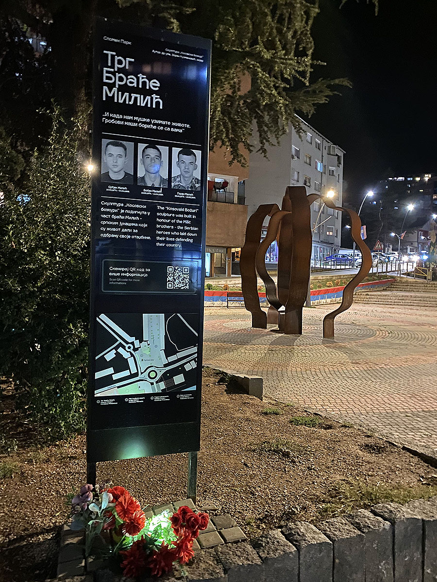 Naspram grafita “Severna brigada” je mračni deo trga. U tom mraku kriju se spomen-ploča i spomenik srpskim božurima, braći Milić. Srđan, Boban i Goran dali su svoje mlade živote 1999. i 2000. godine za odbranu otadžbine. Bili su vojnici. Bili su mladi ljudi, časni i hrabri. Ostale su seni čiji odsjaj kao da otkriva samo Ibar, koji pored tiho teče. Sada je vreme vukova. Oni su glasni, njihovi simboli svetle… Ima li ljudi preko Ibra, u južnom delu Mitrovice? I tamo svetli, i s one strane Ibar svetluca od seni pale mladosti. Pomirene i smirene u večnosti.